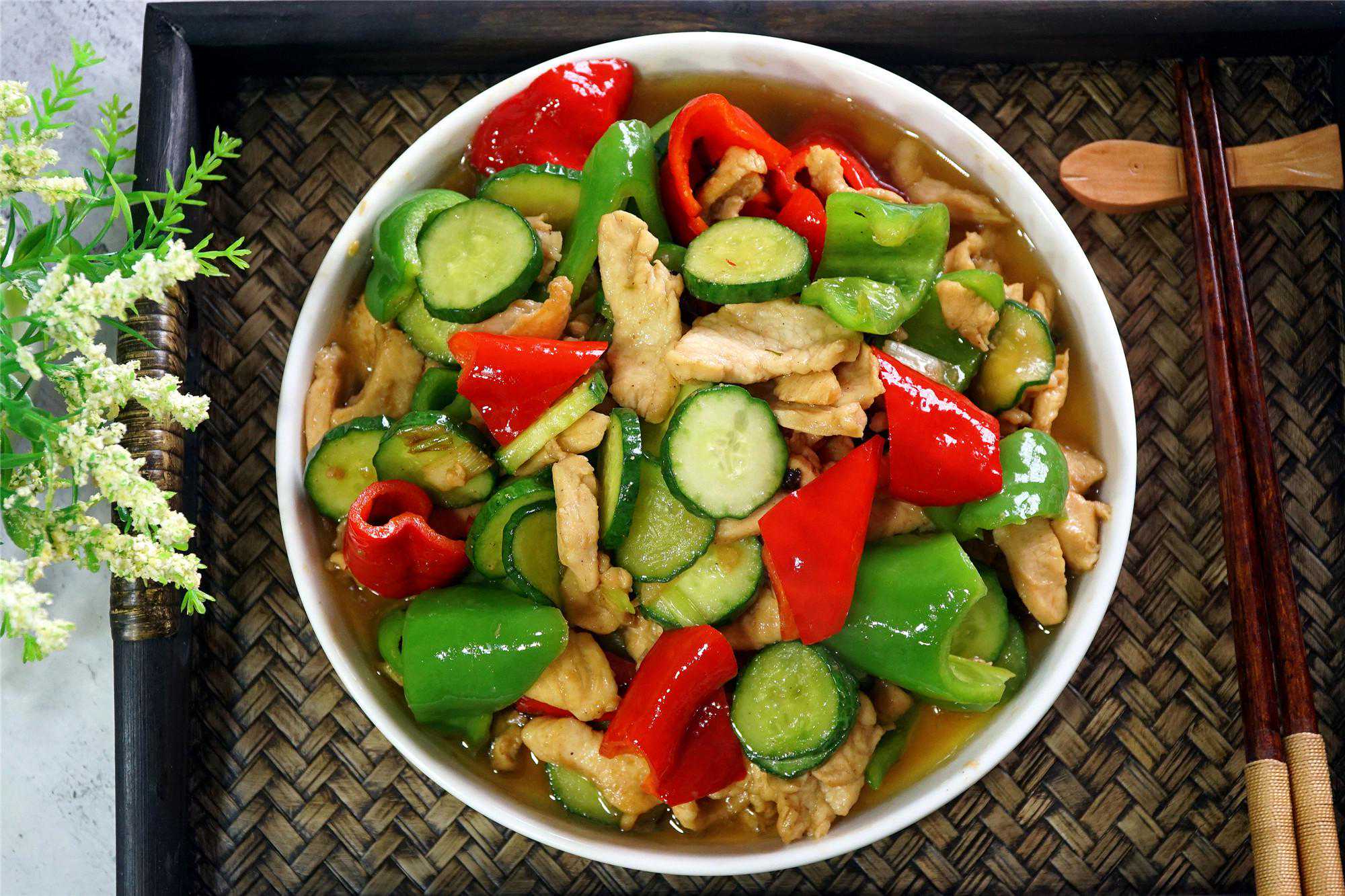 1、鸡脯肉冲洗干净,切薄片;黄瓜切片,青红椒切滚刀块备用。