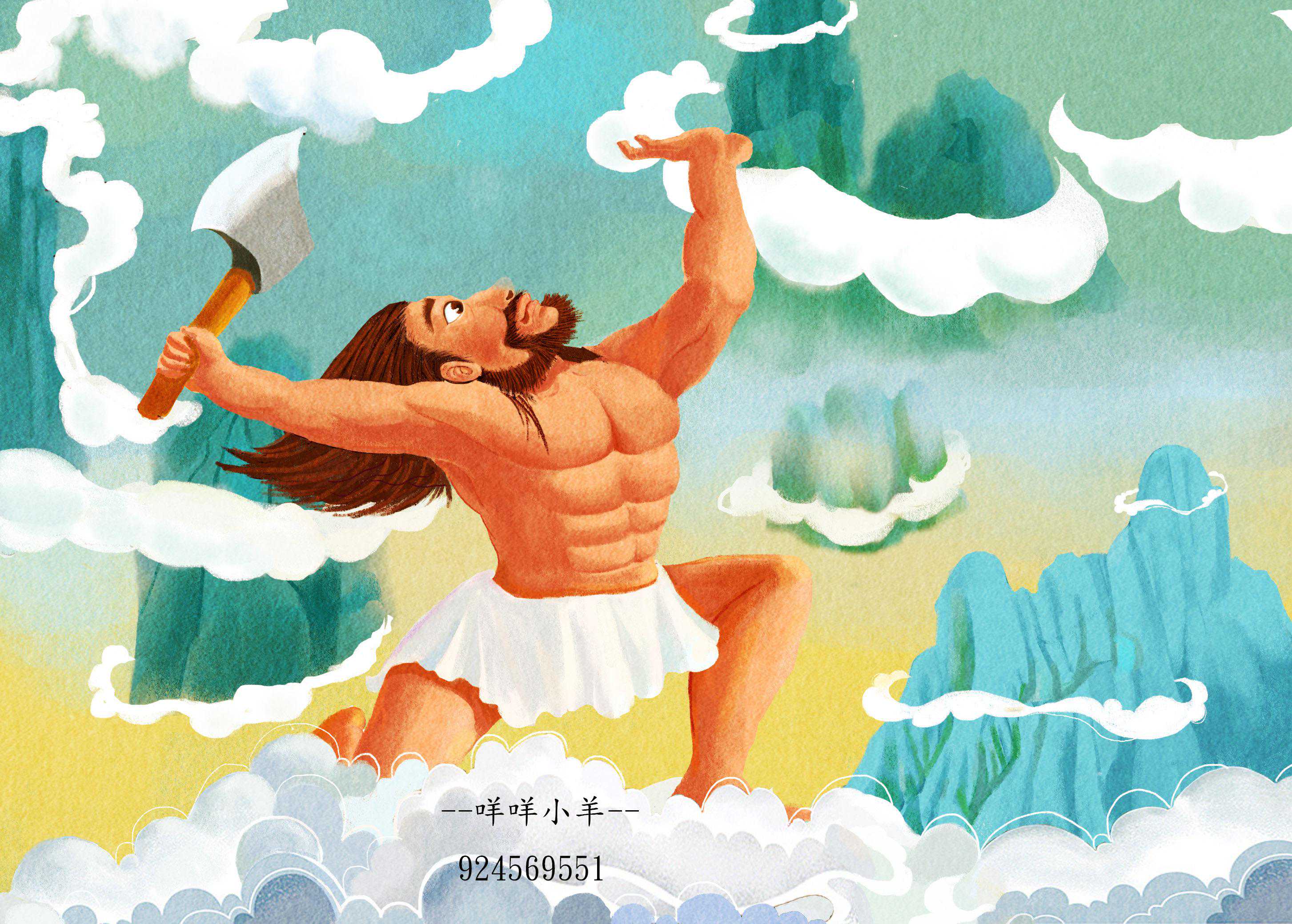 有一天,盘古突然醒了。他见周围一片漆黑,他就抡起大斧头,朝眼前的黑暗猛劈过去了。只听一声巨响,一片黑暗的东西渐渐分散开了。缓缓上升的东西,变成了天;慢慢下降的东西,变成了地。
