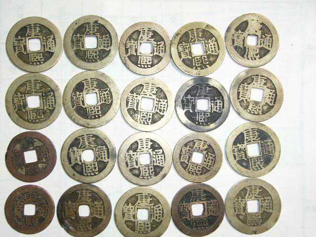 严格康熙套钱,共有四套,双点一套,单点一套,罗汉式一套,半分制式一套,其中罗汉套难度最大,双点套“东.河.江”单点套的“台.陕.漳”比较难找外。其他的都较多