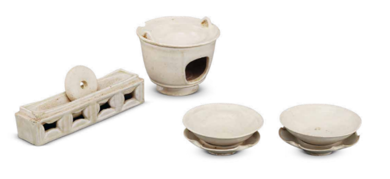 这套2022年出土于山西长治屈家庄村唐墓的白釉茶具组合。囊括了茶碾、茶炉与茶釜(该器物的茶釜与风炉连为一体)及茶盏托,器物十分精美,组合完整,是唐代茶室的最新考古成果之一。反映了基础的煎茶法:先用茶碾碾茶饼(左一),风炉内放置炭火,茶釜中依次放入适量的水、盐、茶粉(左二),最后将茶汤添入茶碗以盏托饮茶。