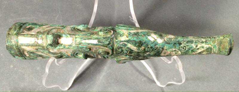 这是一件2000年前,战国时期的,戈墩,戈墩是干嘛的,大家看过电视没有啊,春秋战国争霸类的故事,什么《大秦帝国》啊,《秦始皇》啊,如果这么没看过,《三国演义》总看过吧,两军交战时,士兵棍子上端绑着兵器------戈,而棍子的另一头,则是戈墩,是成套兵器的配件,一般的士兵,哪有有戈墩的,而级别高一点的,没有工艺,级别再高的将军使用,估计也就用点工艺铸造纹饰等等,但看这件戈墩,错银,可见级别之高,应该是战国时期某位将军用过的。