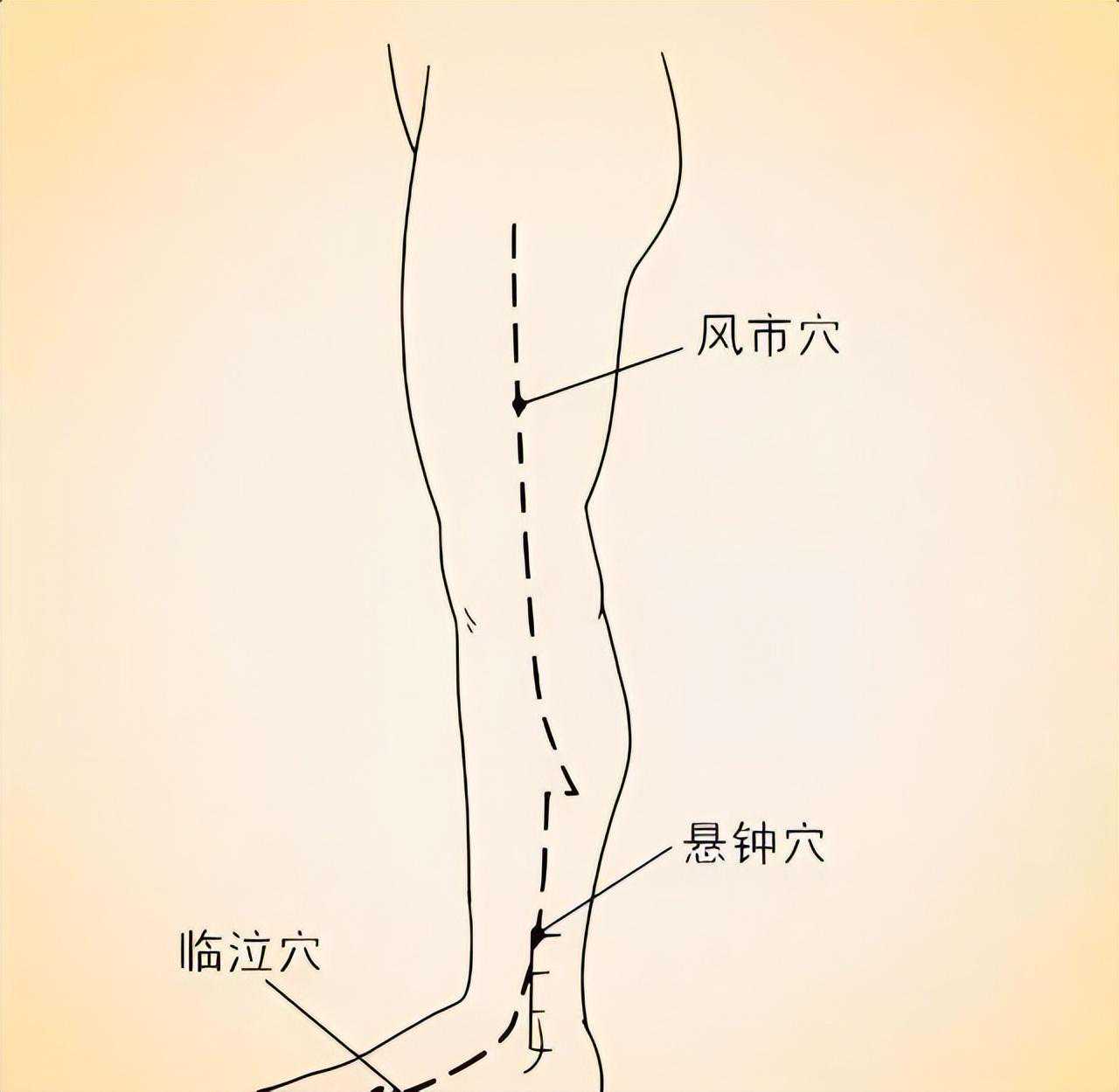 风市穴是足少阳胆经的腧穴,位于下肢的大腿外侧,当人站着的时候,双手会下垂,而中指的尖端就是这个穴位。