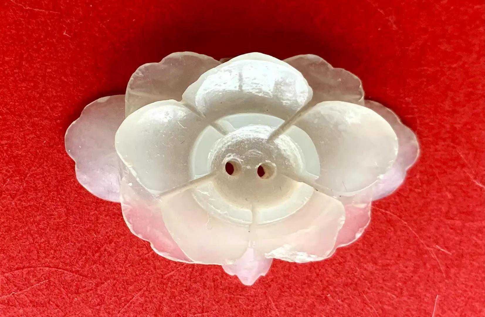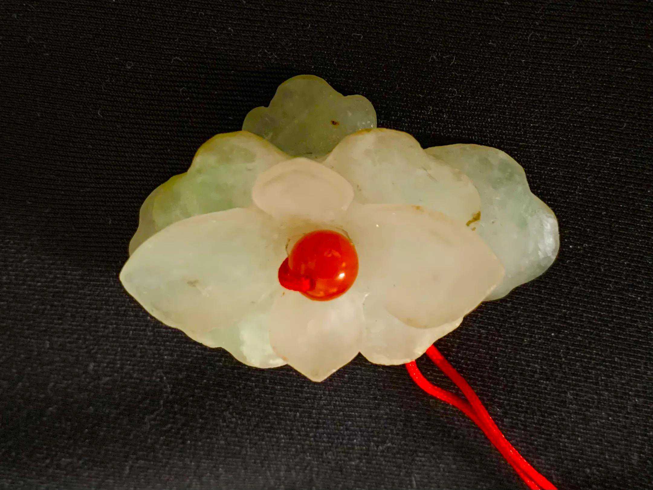 这枚帽花,上等翡翠;品相完整,品位不低。也是我众多玉帽花中很喜欢的一枚帽花。