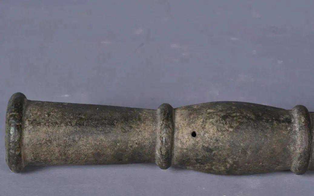 这是一件明代的铜火铳,1981年托克托县黑城子乡征集,属于手铳。火铳利用火药在膛内燃烧所产生的气体压力发射弹丸。火铳铳身分为三部分:前膛(铳膛)、药室和尾銎。前膛约占铳体的2/3,用来放置弹丸;药室呈瓮形,用于装填火药,药室两端共有三道箍,以加固铳身,防止爆裂,药室上有火门,火捻从中通出;尾銎部可以插上手柄,方便举放。