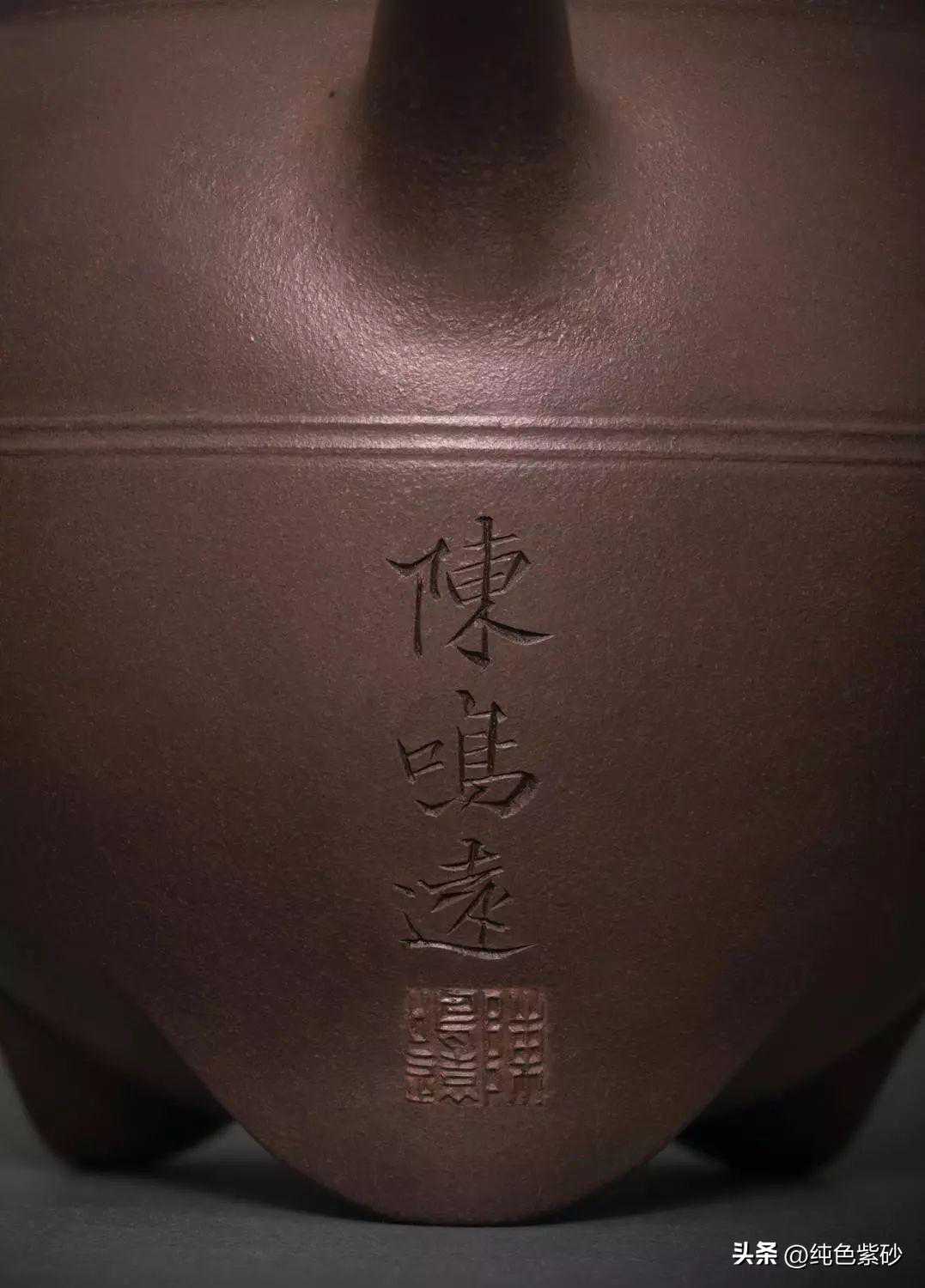沿壶身堆塑素带纹一圈,简洁雅致,有冲淡素朴之美。流下方壶腹位置有“陈鸣远”楷书款识并篆书印款。