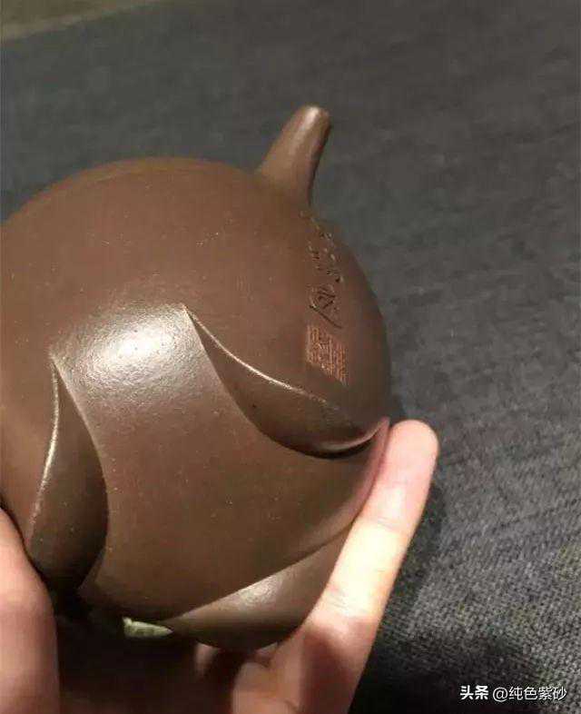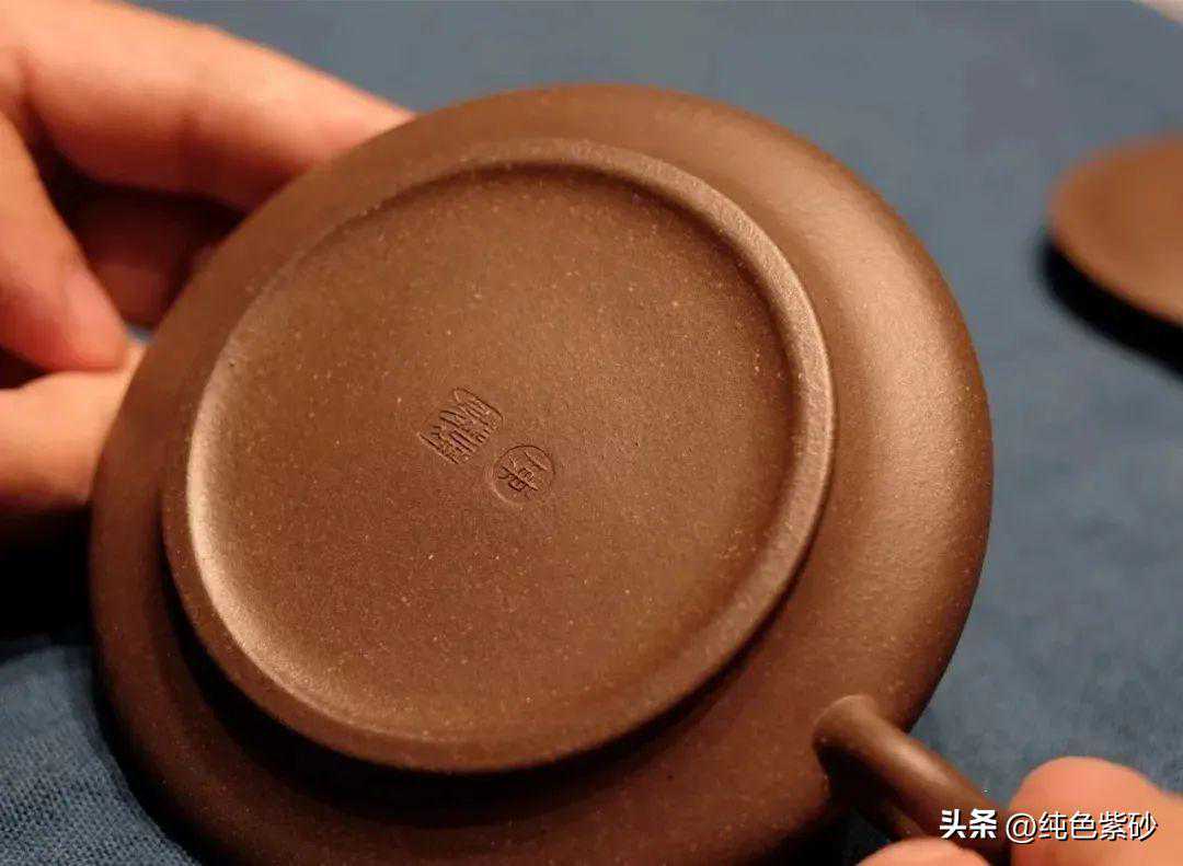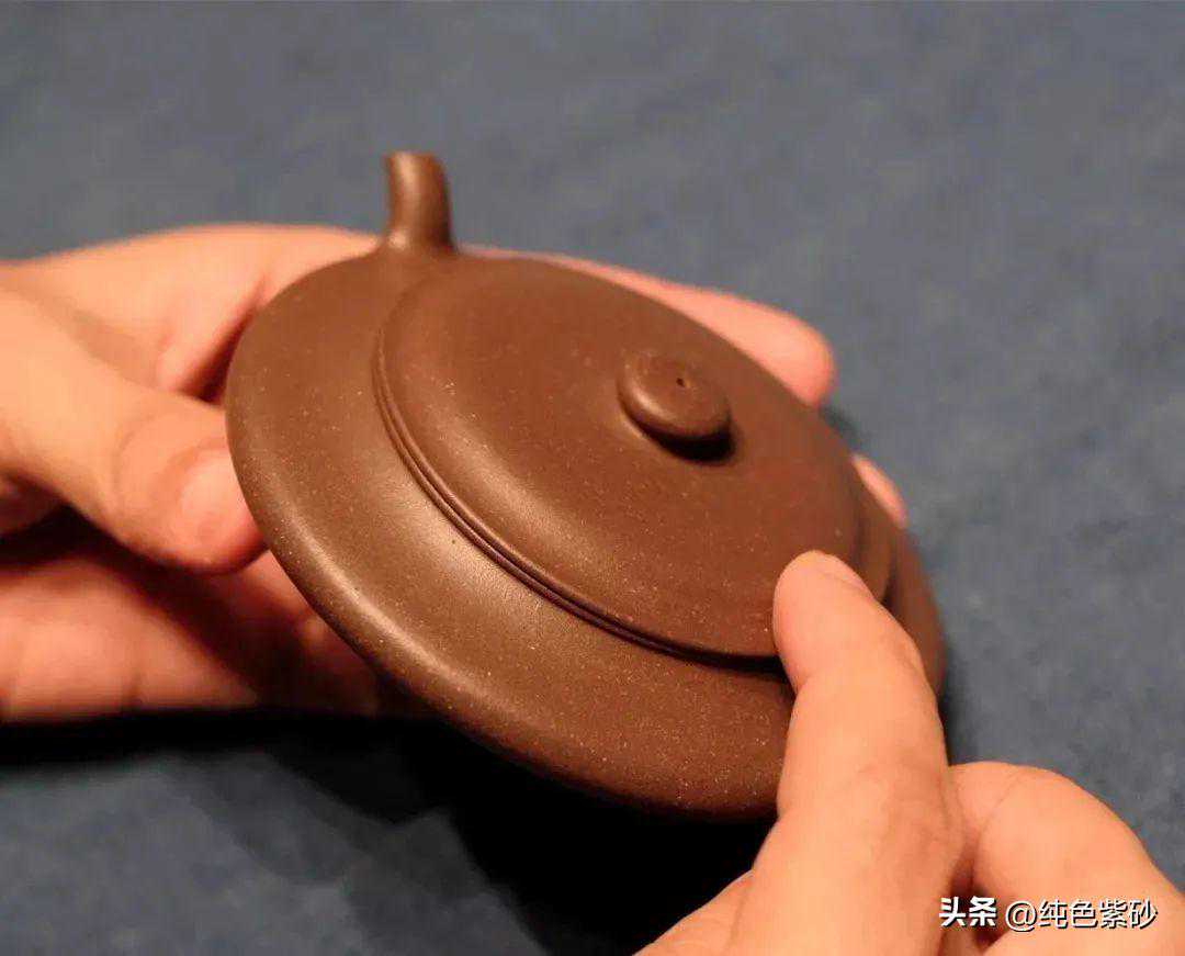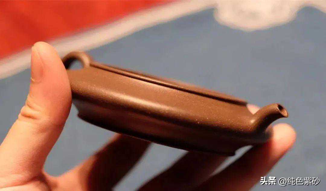 这件作品壶形极扁,适合冲饮绿茶。器形线面屈曲和谐,形虽扁气却昂,纯朴大度。