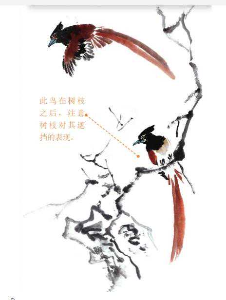 9、参照上面的步骤,在梅枝上添画另一只绶带鸟。