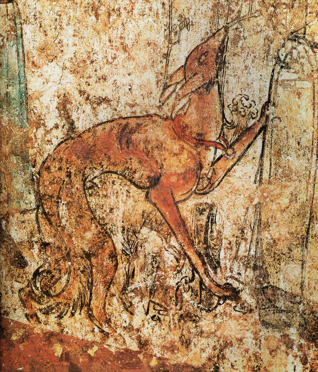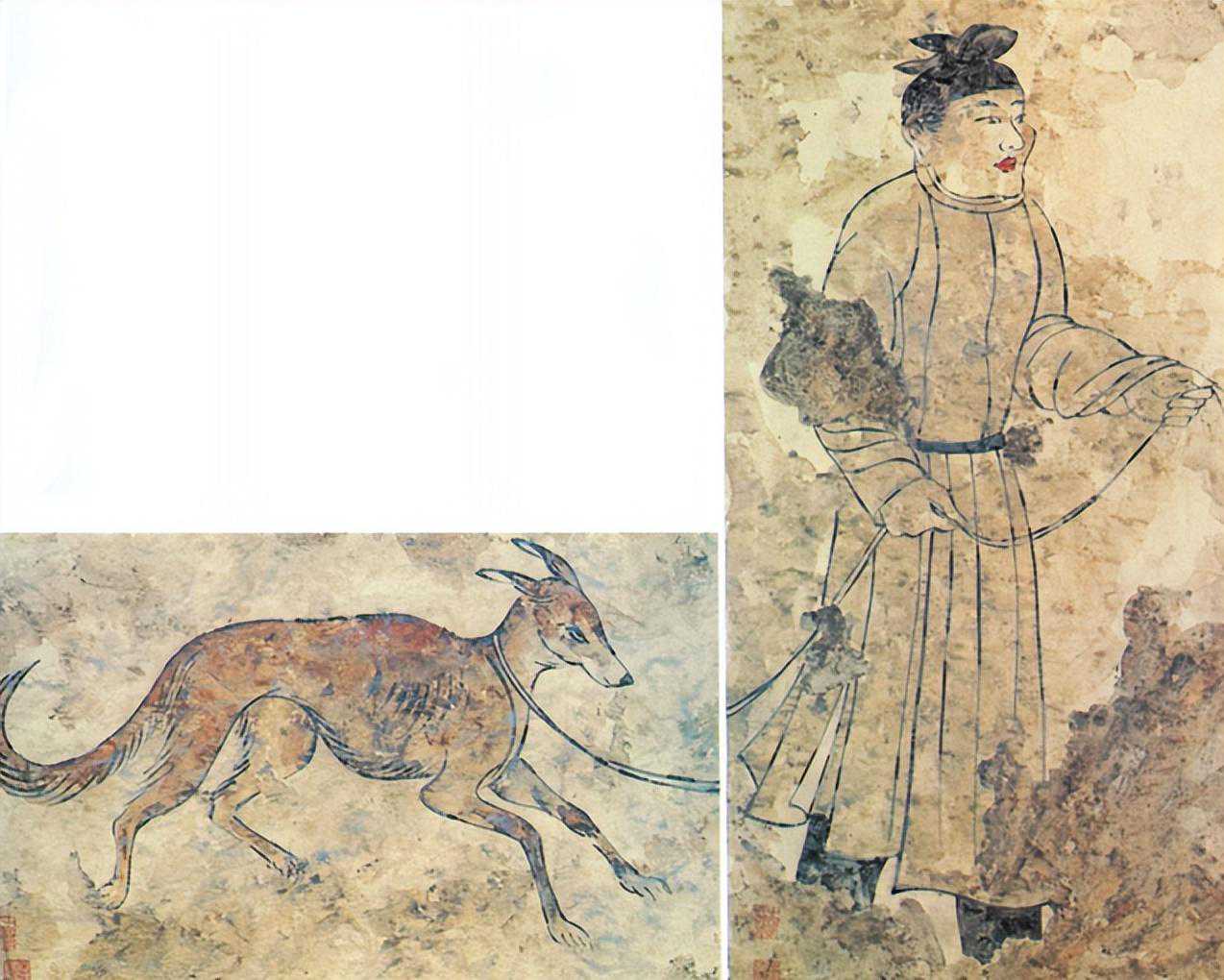 鹰犬是唐代狩猎最常见的助猎动物,唐宫五坊除四坊为飞禽外,剩下那一坊便是狗坊。狗坊中的稀有品种当属外来进贡的波斯犬,懿德太子墓壁画《架鹞戏犬图》,万泉县主薛氏墓壁画《牵犬男侍图》都有描绘。波斯犬尖吻、细腰、长腿,凭视觉追击猎物,跑起来身轻如燕,速度极快。
