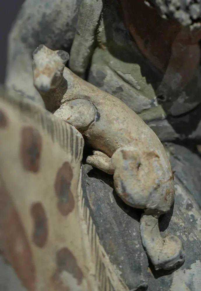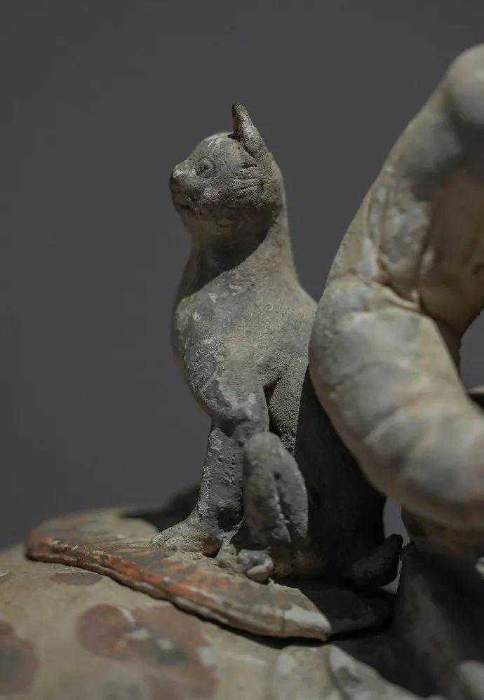 猞猁秉性古怪,喜欢独来独往,且耐寒,冬天捕猎极有优势。它可以一动不动在一个地方呆上好几天,遇到危险还会躺在地上装死,狡猾又谨慎。看它乖乖地坐在女猎师身后,可想而知,一旦和人成为朋友,猞猁也是一大得力助手。章怀太子墓《狩猎出行图》中也蹲有一只猞猁,却不如金乡县主这件带猞猁狩猎女俑有看头,毕竟女子驯兽、骑马猎兽,无论古今,都是一大挑战。