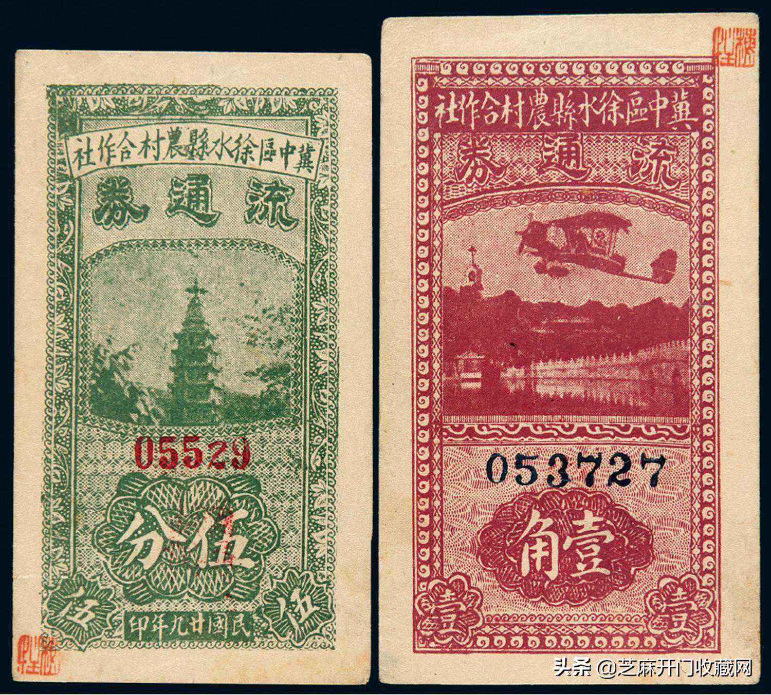 民国二十九年冀中区徐水县农村合作社流通券伍分、壹角各一枚九品,成交价格:RMB149500