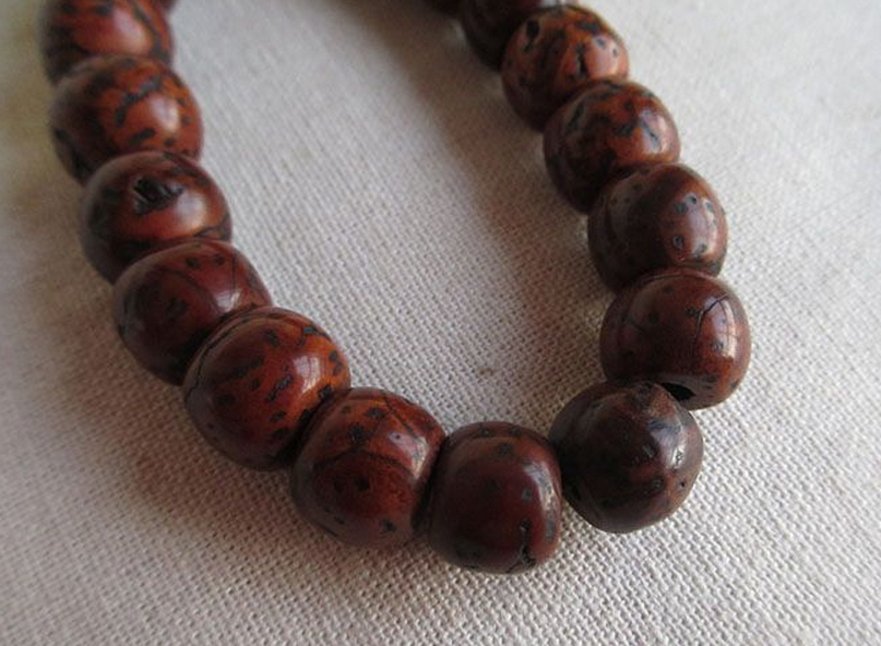 龙眼菩提的颜色是褐黄色的,椭圆的形状,因为它的每一粒上都有三角状眯眼的像龙眼的斑点,所以人们美其名为龙眼菩提。“龙”梵语音译为“那伽”,具有呼风唤雨的能力,也是守护佛法的护法。龙眼菩提,尤其是印度龙眼菩提,是难得之物,即是修练者必备法器,又是驱邪增慧之品。