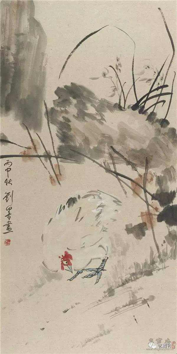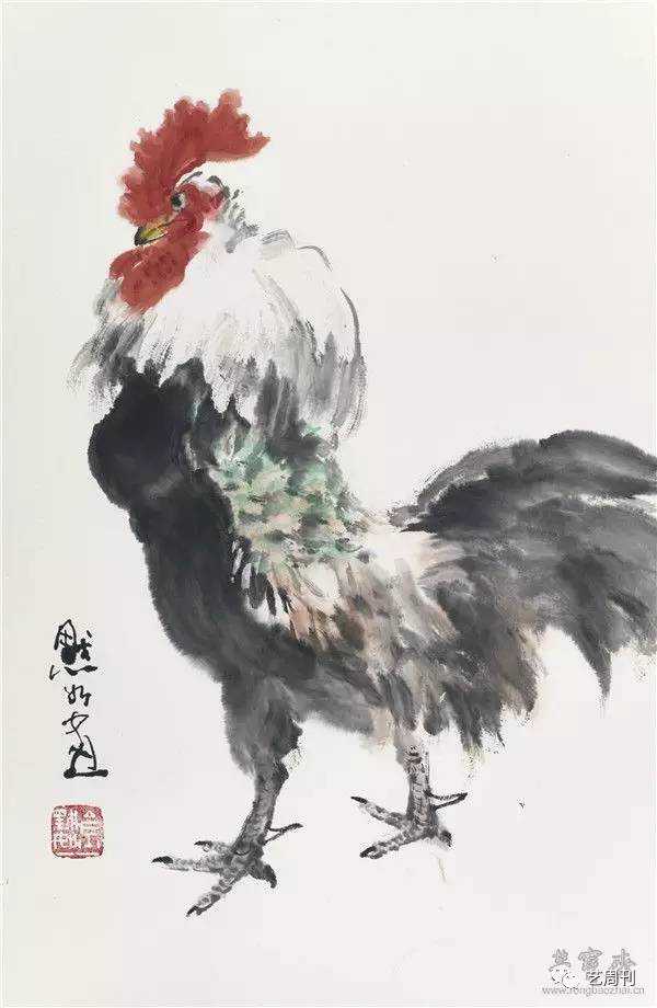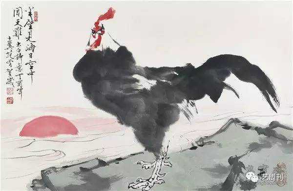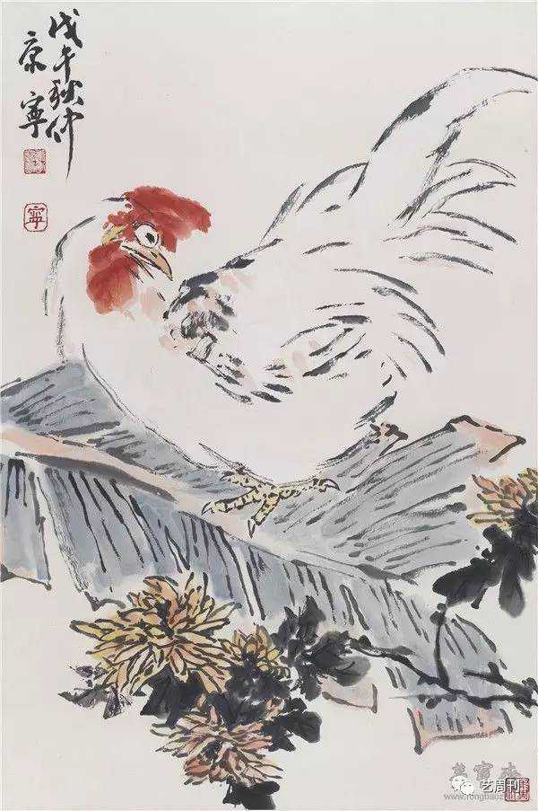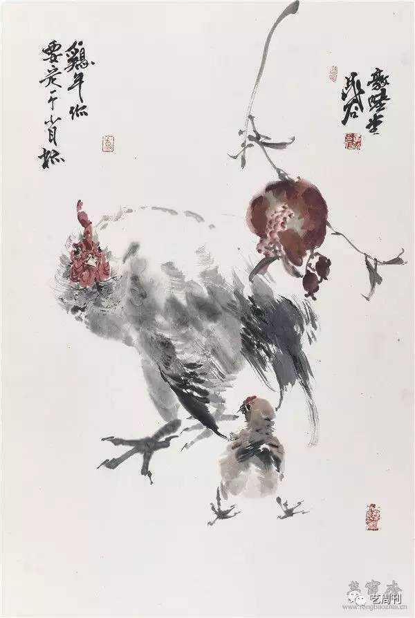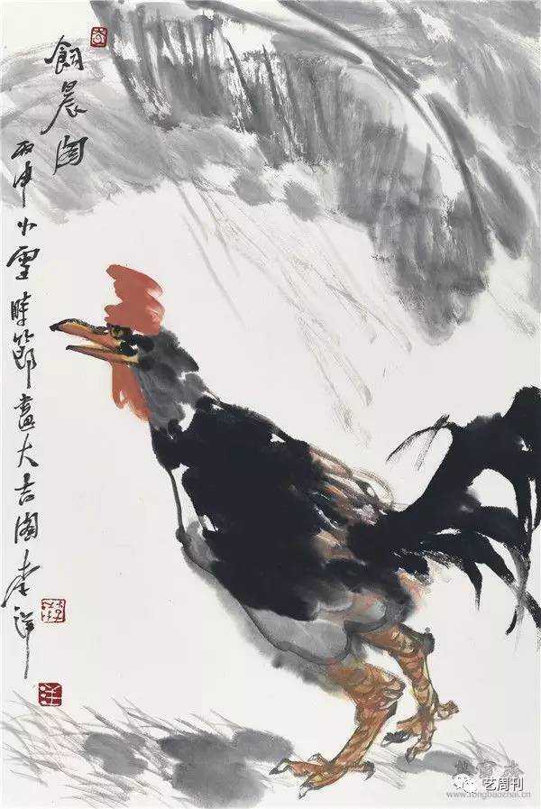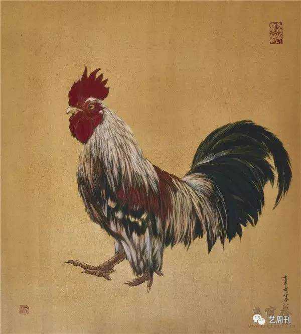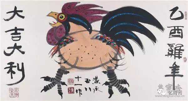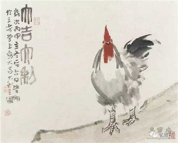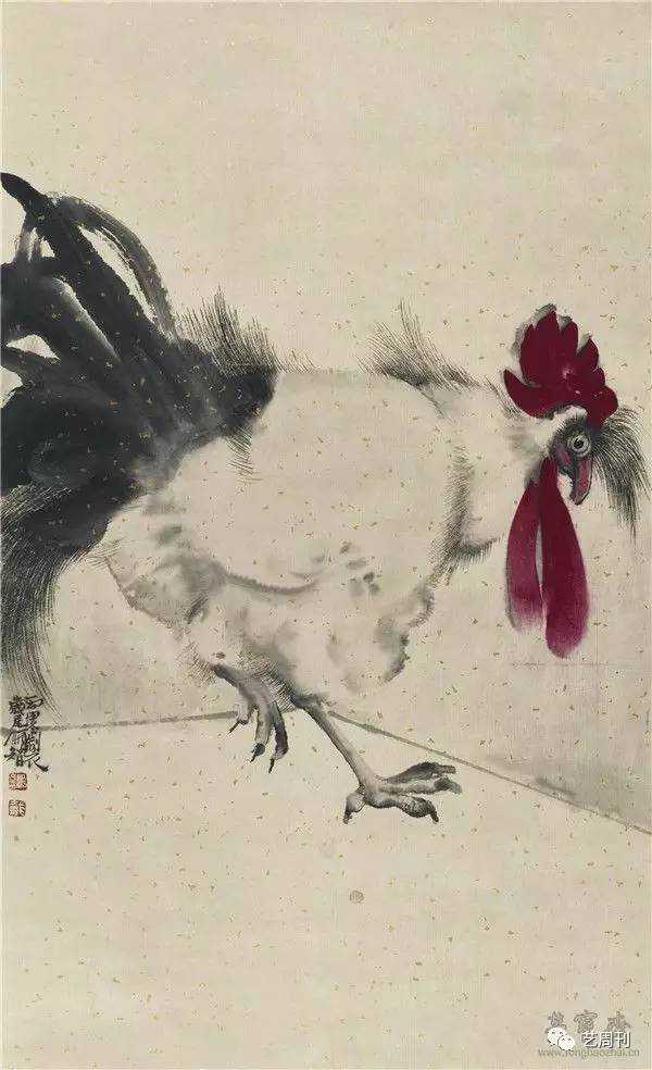 在我国悠久的民间生肖文化中,鸡是极具代表性的一种。据载,中国人驯化鸡禽可以追溯到8000年前的史前岁月中,这在甘肃天水西山坪大地湾一期文化中早有明证。此外,甲骨文中已有“鸡”字的出现。《太平御览》中也作“黄帝之时,以凤为鸡”。《荆楚岁时记》中载“正月一日,贴画鸡户上,悬苇索于其上,插桃符其旁,百鬼畏之”,此习俗后流传于巴蜀民间。“桃花坞”旧年画中亦有“鸡王镇宅”的风尚。另外,在我国浩瀚的文学长河里,鸡也是诗人们吟唱的常见题材。《诗经》中有“风雨如晦,鸡鸣不已”,虽是用来起兴,但足以说明鸡作为一种生活中的日常之物而纳入了人们的视野。唐人顾况的《过山农家》有“板桥人渡泉声,茅檐日午鸡鸣”的句子。此时的“鸡鸣”恰好烘托出一个极具生活情趣的、其乐融融的农家田园景象。明代的画家唐寅在他的《画鸡》中更是兼工带写般地用语言画出了一只活脱脱、神采飞扬的鸡来:“头上红冠不用裁,满身雪白走将来。平生不敢轻言语,一叫千门万户开。”