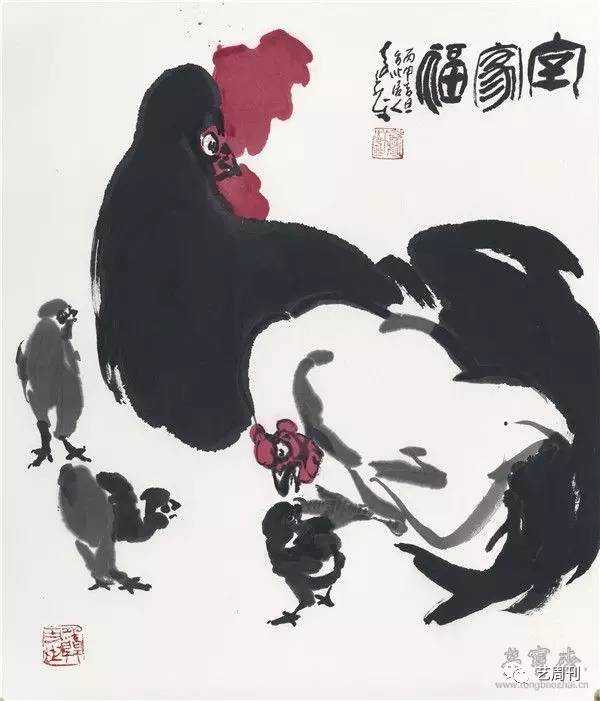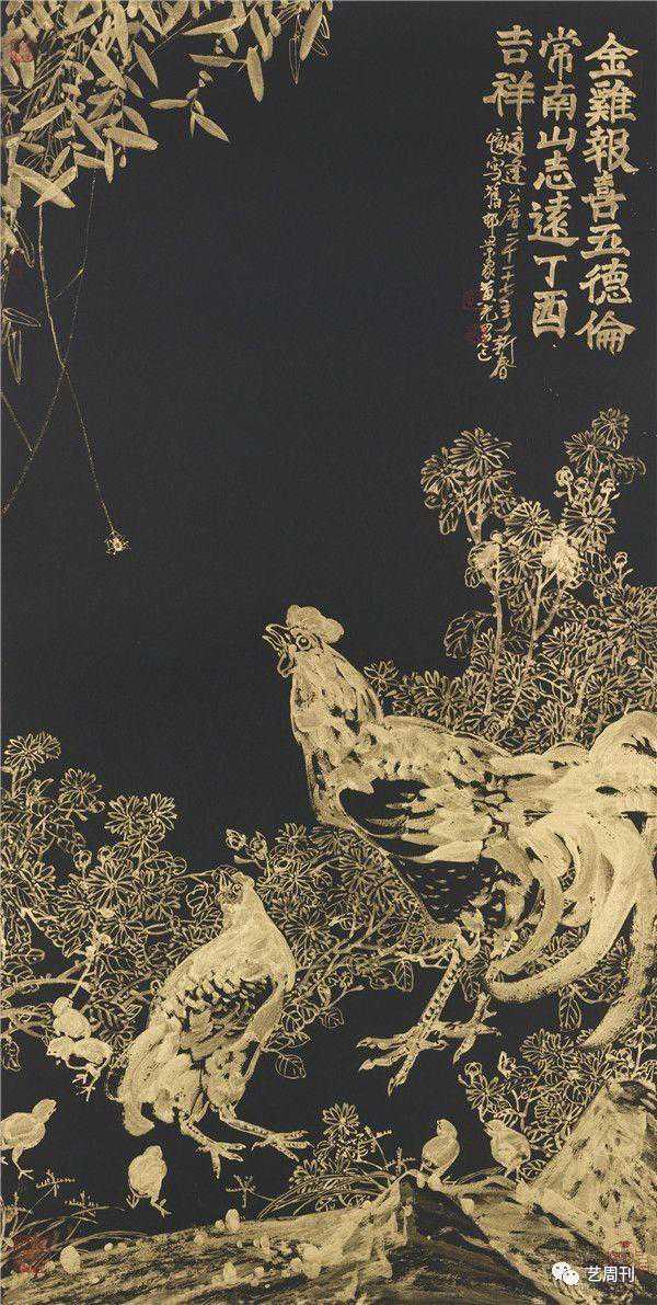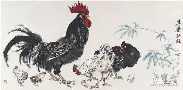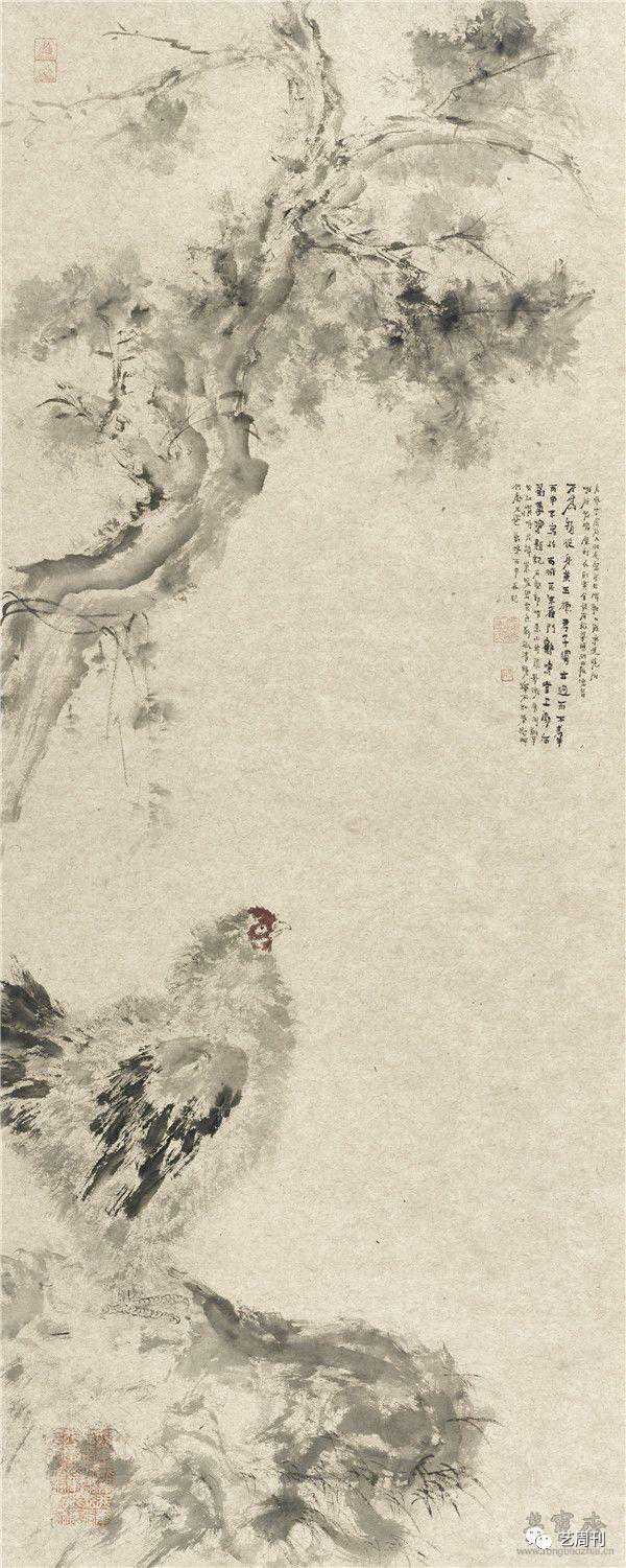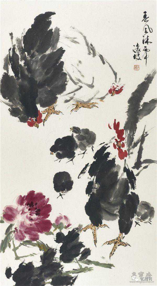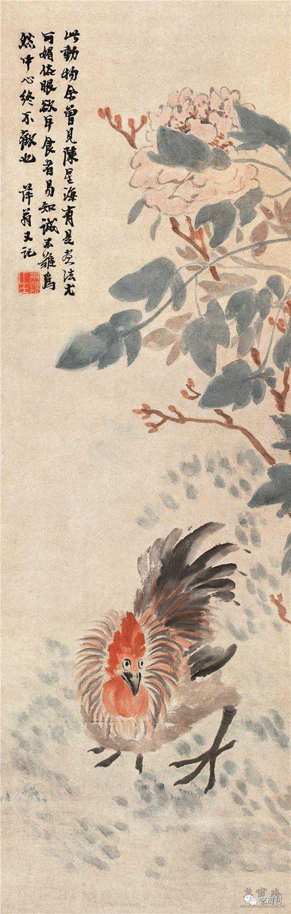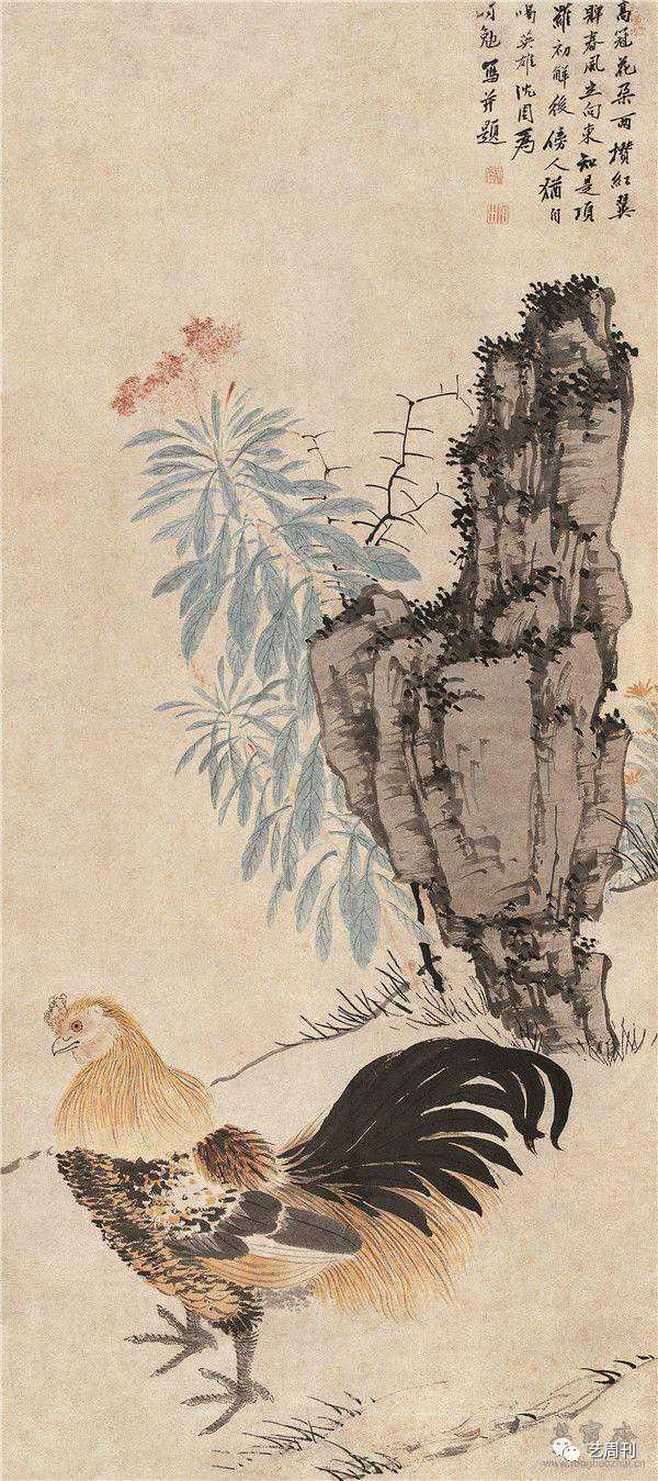 在我国悠久的民间生肖文化中,鸡是极具代表性的一种。据载,中国人驯化鸡禽可以追溯到8000年前的史前岁月中,这在甘肃天水西山坪大地湾一期文化中早有明证。此外,甲骨文中已有“鸡”字的出现。《太平御览》中也作“黄帝之时,以凤为鸡”。《荆楚岁时记》中载“正月一日,贴画鸡户上,悬苇索于其上,插桃符其旁,百鬼畏之”,此习俗后流传于巴蜀民间。“桃花坞”旧年画中亦有“鸡王镇宅”的风尚。另外,在我国浩瀚的文学长河里,鸡也是诗人们吟唱的常见题材。《诗经》中有“风雨如晦,鸡鸣不已”,虽是用来起兴,但足以说明鸡作为一种生活中的日常之物而纳入了人们的视野。唐人顾况的《过山农家》有“板桥人渡泉声,茅檐日午鸡鸣”的句子。此时的“鸡鸣”恰好烘托出一个极具生活情趣的、其乐融融的农家田园景象。明代的画家唐寅在他的《画鸡》中更是兼工带写般地用语言画出了一只活脱脱、神采飞扬的鸡来:“头上红冠不用裁,满身雪白走将来。平生不敢轻言语,一叫千门万户开。”