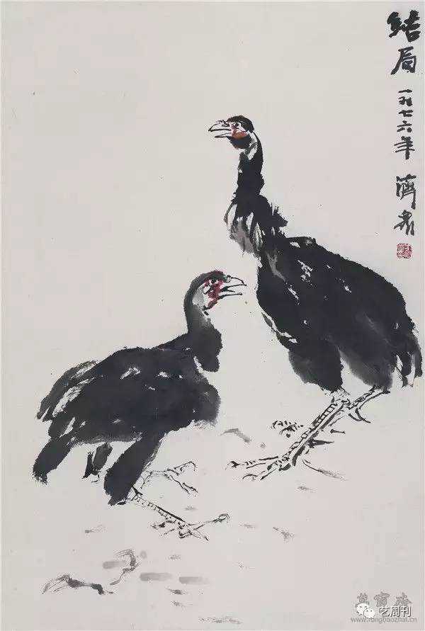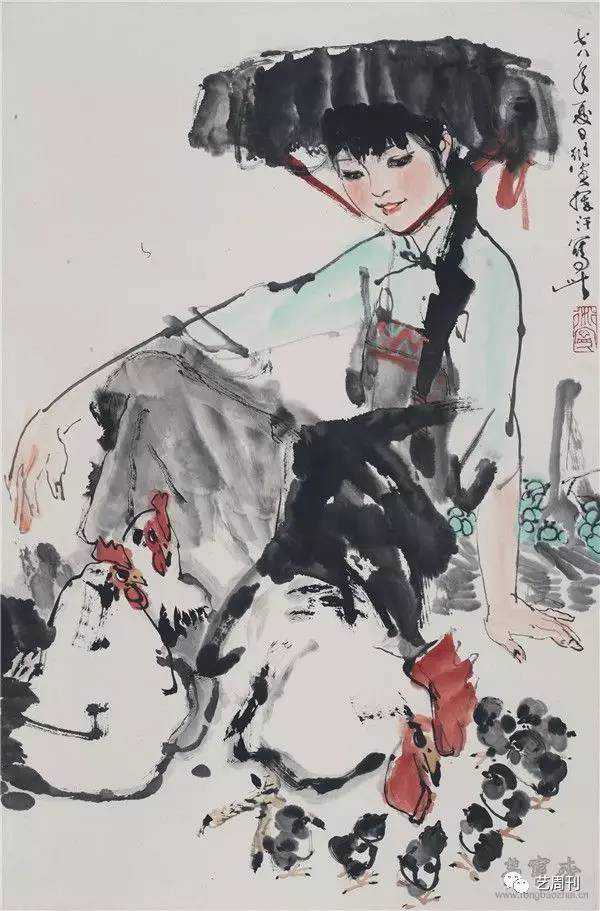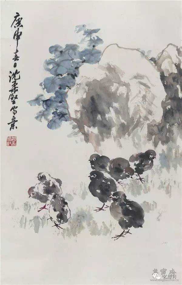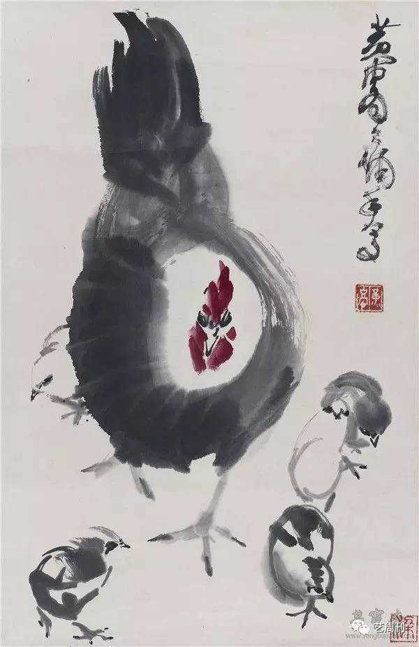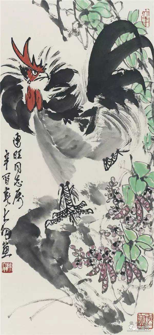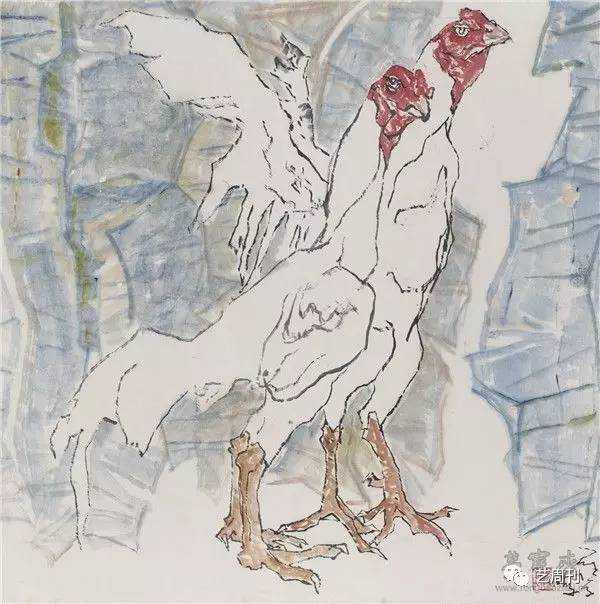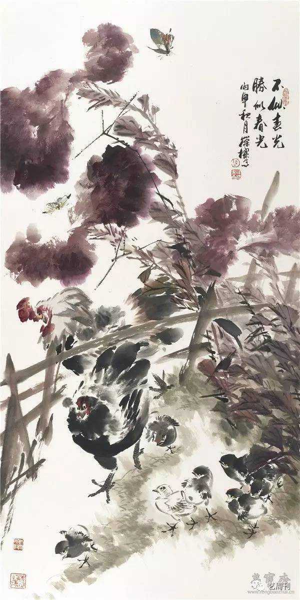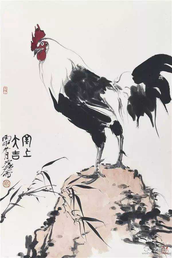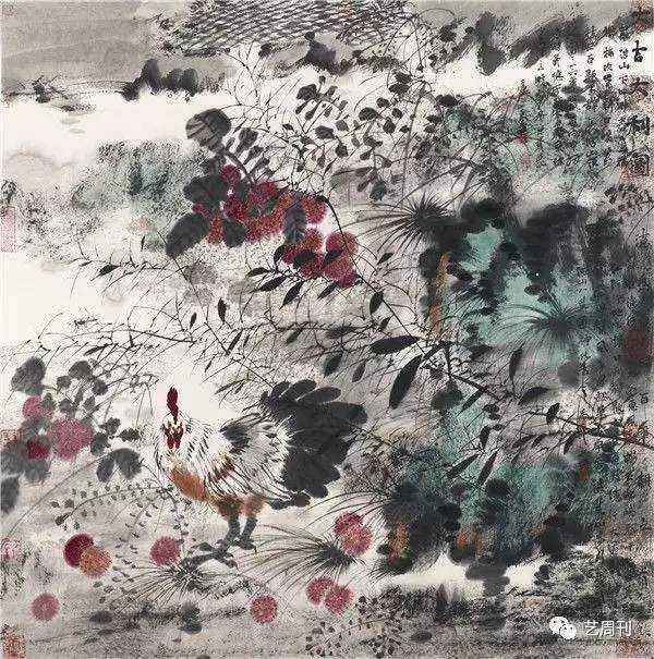 在我国悠久的民间生肖文化中,鸡是极具代表性的一种。据载,中国人驯化鸡禽可以追溯到8000年前的史前岁月中,这在甘肃天水西山坪大地湾一期文化中早有明证。此外,甲骨文中已有“鸡”字的出现。《太平御览》中也作“黄帝之时,以凤为鸡”。《荆楚岁时记》中载“正月一日,贴画鸡户上,悬苇索于其上,插桃符其旁,百鬼畏之”,此习俗后流传于巴蜀民间。“桃花坞”旧年画中亦有“鸡王镇宅”的风尚。另外,在我国浩瀚的文学长河里,鸡也是诗人们吟唱的常见题材。《诗经》中有“风雨如晦,鸡鸣不已”,虽是用来起兴,但足以说明鸡作为一种生活中的日常之物而纳入了人们的视野。唐人顾况的《过山农家》有“板桥人渡泉声,茅檐日午鸡鸣”的句子。此时的“鸡鸣”恰好烘托出一个极具生活情趣的、其乐融融的农家田园景象。明代的画家唐寅在他的《画鸡》中更是兼工带写般地用语言画出了一只活脱脱、神采飞扬的鸡来:“头上红冠不用裁,满身雪白走将来。平生不敢轻言语,一叫千门万户开。”