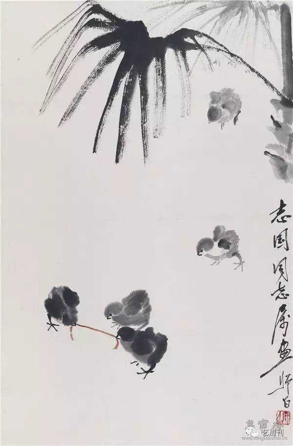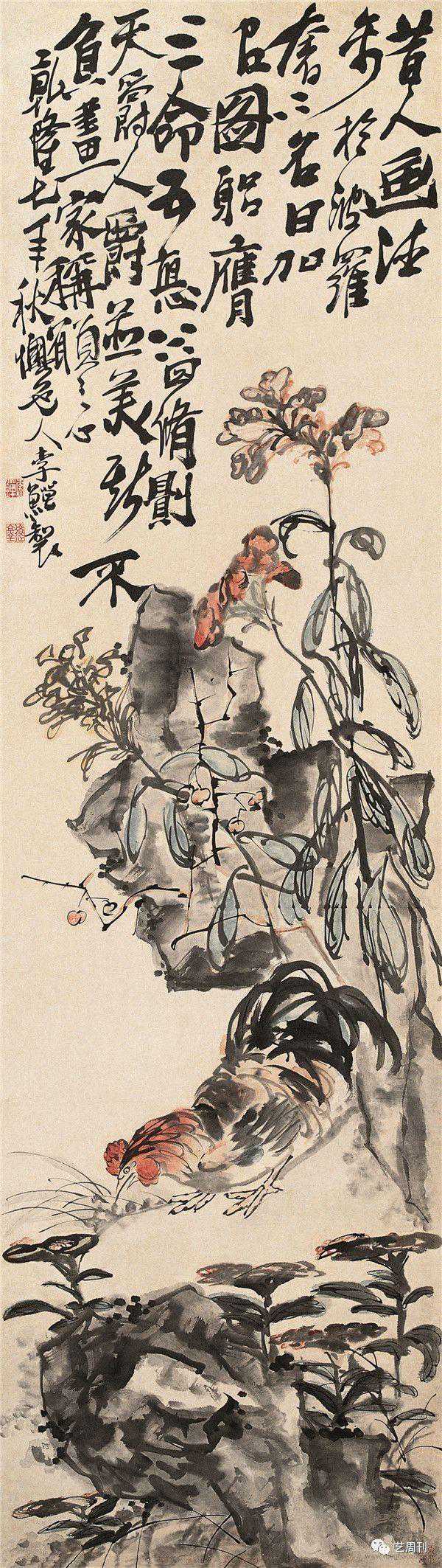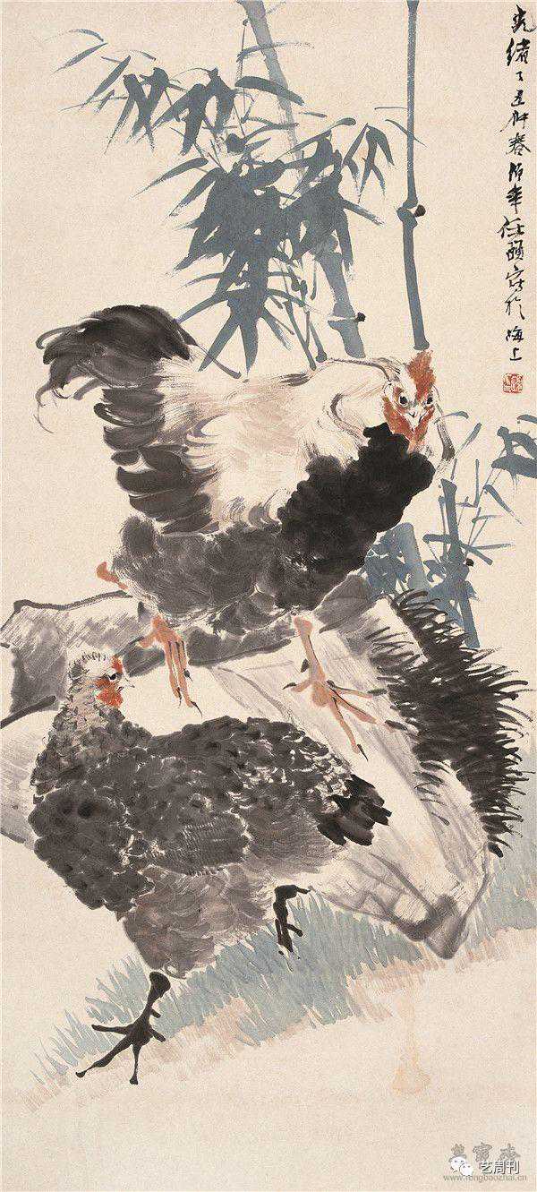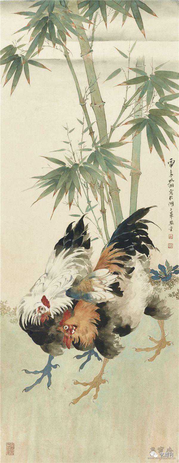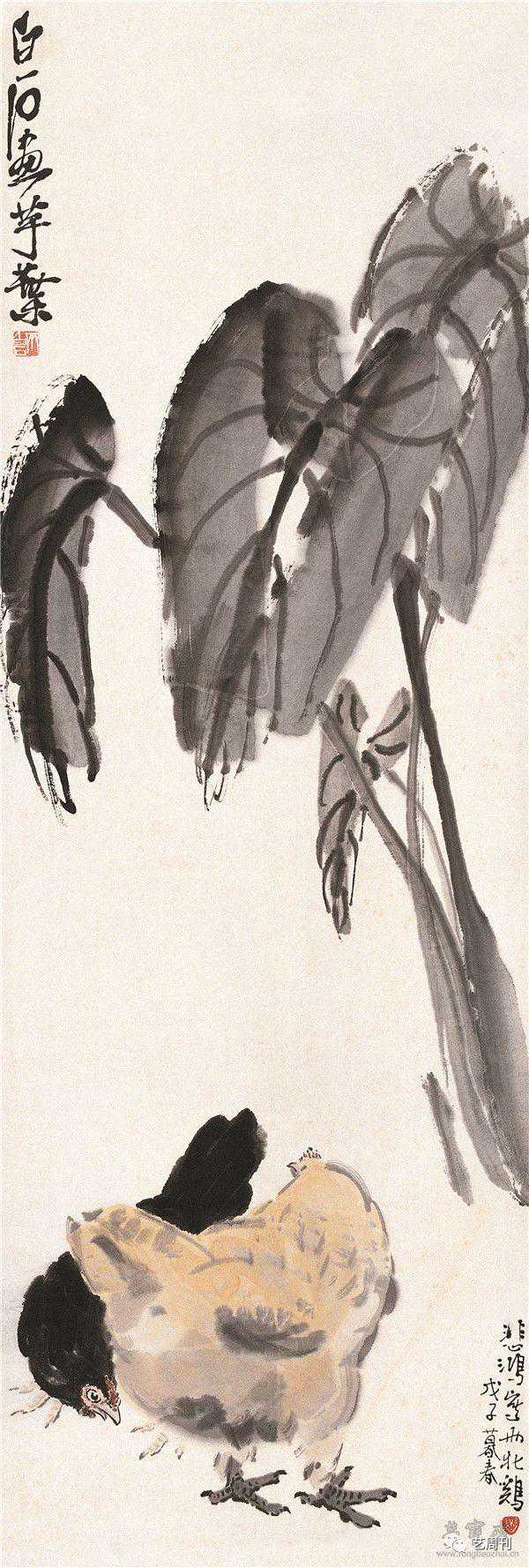 齐白石、徐悲鸿芋叶双鸡图102cm×34.5cm