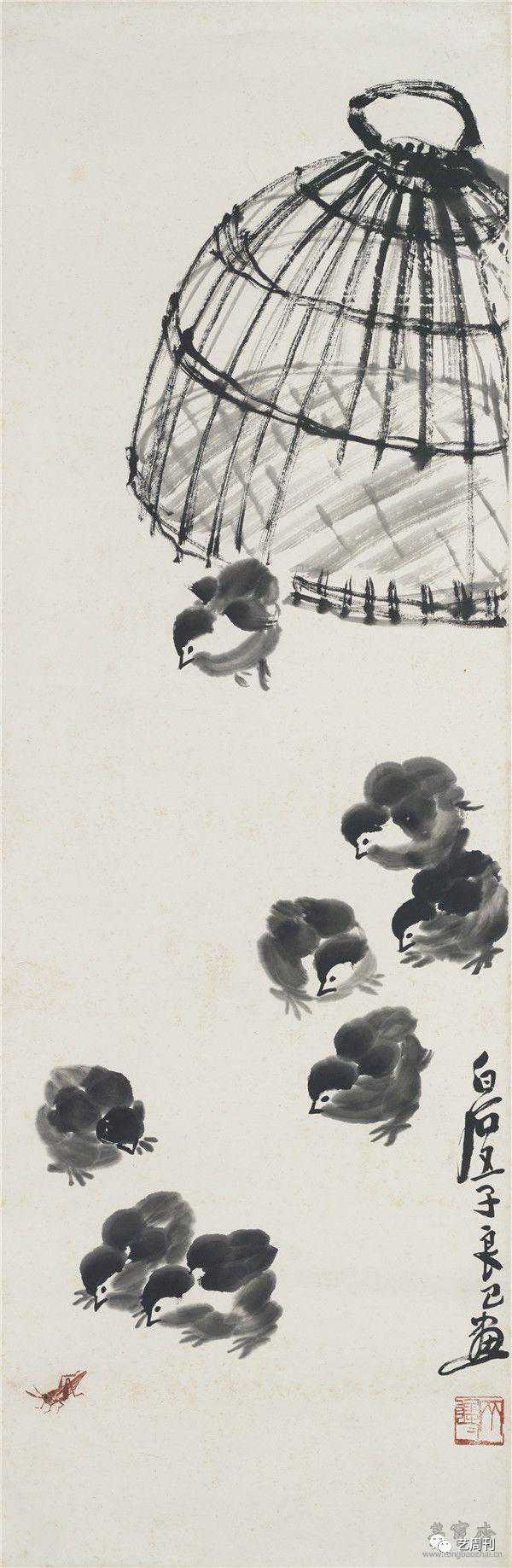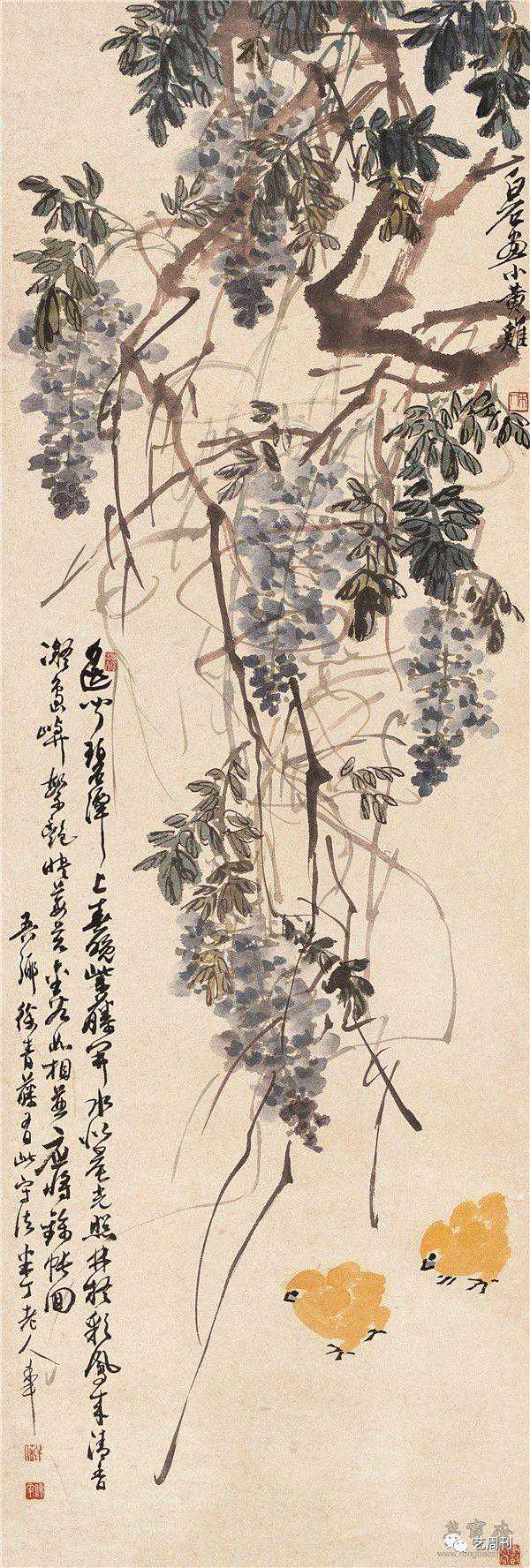 齐白石、陈半丁紫藤雏鸡图118cm×40cm