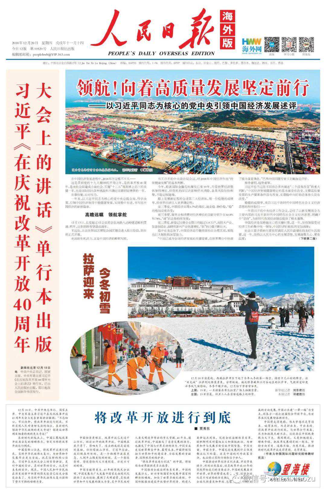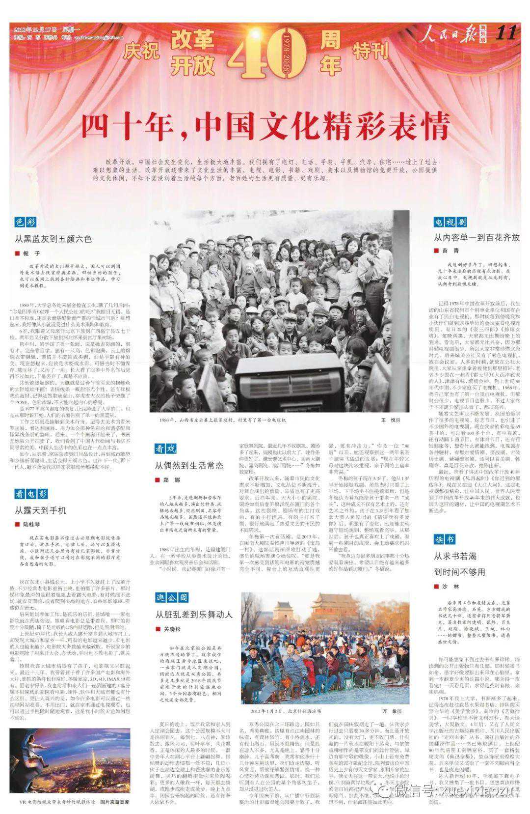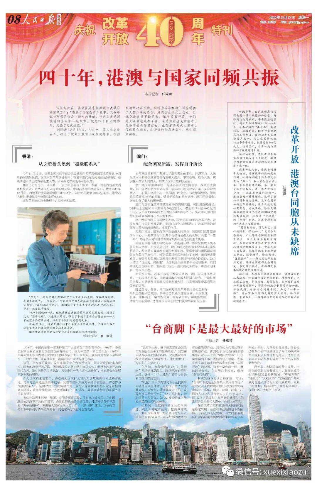 为纪念12月18日中国改革开放40周年这个特殊的日子,海外版从17日起连续3天推出“庆祝改革开放40周年特刊”,报道均在一版有所体现,并在头版刊出特刊版面截图,清晰标注纪念特刊详见第5版至第12版。