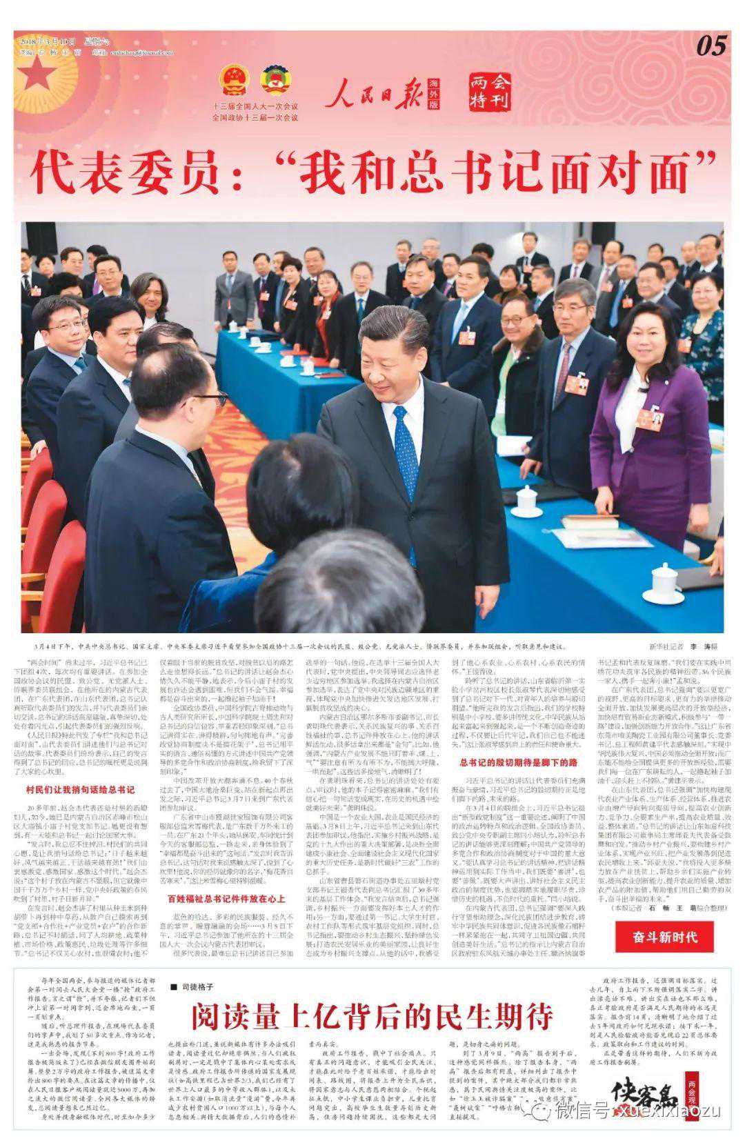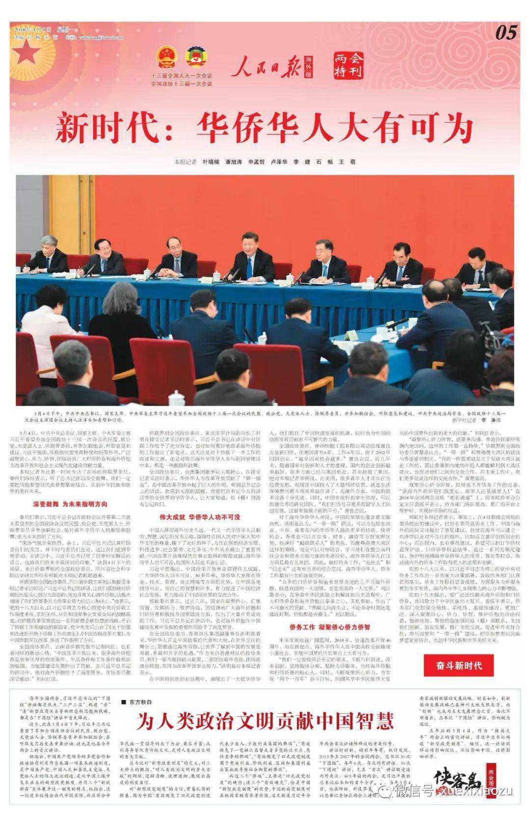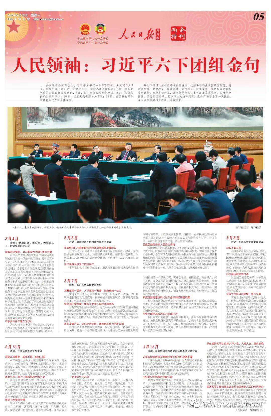如果说习近平同马英九会面通栏照片的使用在当时是偶尔为之,那么,在2018年海外版版面创新实践中,尤其在两会特刊版面上,领导人通栏照片成为常态化运用。比如,3月3日至20日的5版,作为海外版两会报道中的“两会特刊1版”,多次运用通栏图片的版面处理方式。