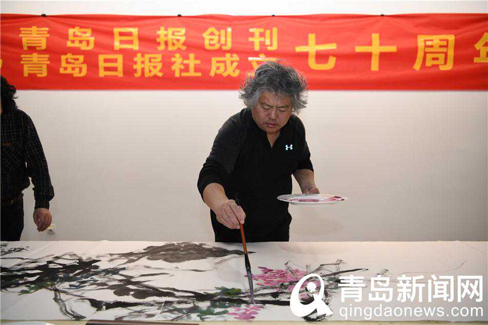青岛市美术馆馆长郝麒现场泼洒丹青。