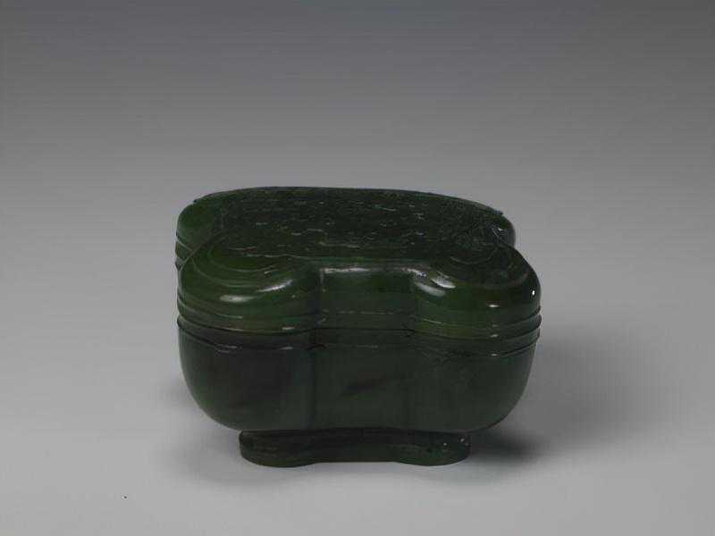 盒青玉质。桃形,薄胎,光素无纹。金盖,采用錾刻、累丝和镶嵌工艺装饰勾莲花纹,并用红绿两色宝石镶嵌。