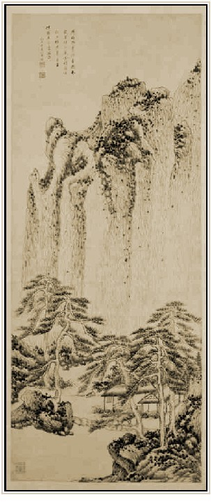 这件作品即描绘了一个夏日山居的情景。画面上一座高山大岭在深谷间蒸腾的云气中挺拔而起,其四周群峰列护。虚实变化,主次有序,气脉贯通。两岸林木葱郁,水阁回廊,茅屋庭院,小路逶迤。数位隐士,在屋中,在院落,或坐或立,闲聊纳凉,好一种清静闲适的山居生活。这件作品亦是画家仿梅道人山水而作,其笔法秀密,墨色清淡,虽少梅道人之迹,然其闲逸之趣,却直追古人。