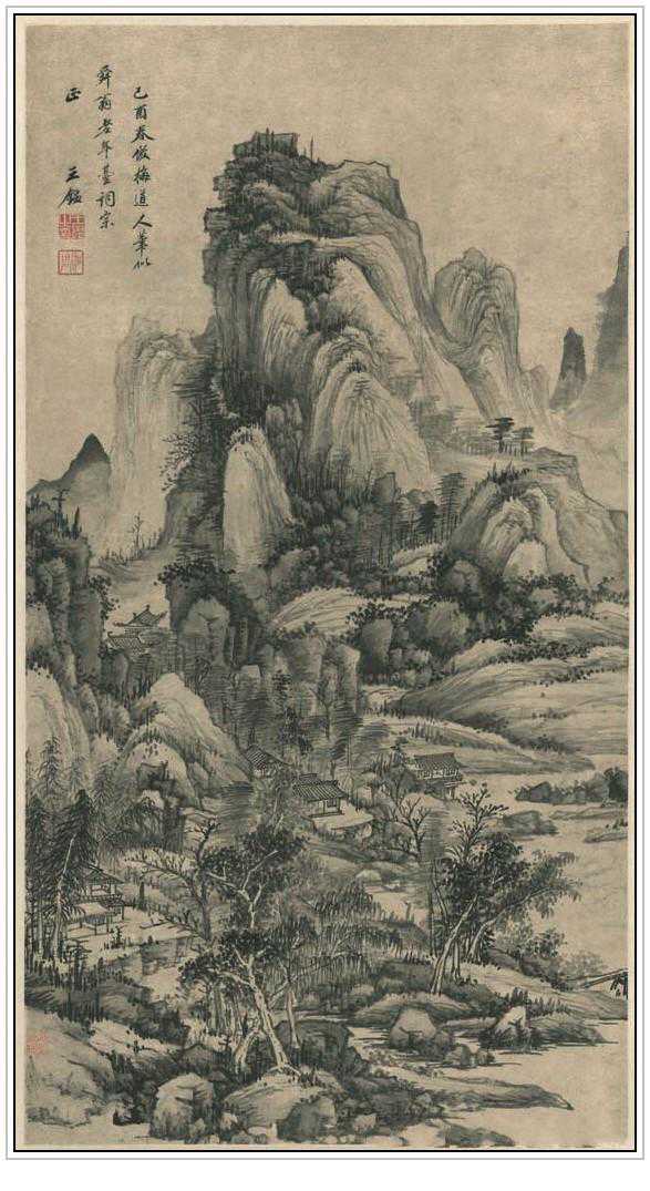 北宋山水画追求的是一种可游可居的景致,用笔用墨都在点滴之间,体现山水为媒的感觉,王鉴模仿元代画家吴镇的这幅《溪山深秀图》也恰到好处地将古人的意境体现得淋漓尽致。在书画收藏大家董其昌收藏吴镇的《溪山深秀图》时,王鉴借来观看了几个月的时间,仿画出了《溪山深秀图》。原来的吴镇的那副《溪山深秀图》就不知下落了。