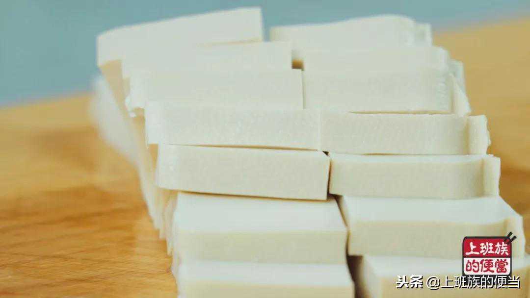 ▲准备一块老豆腐,切成大小一致的方片;