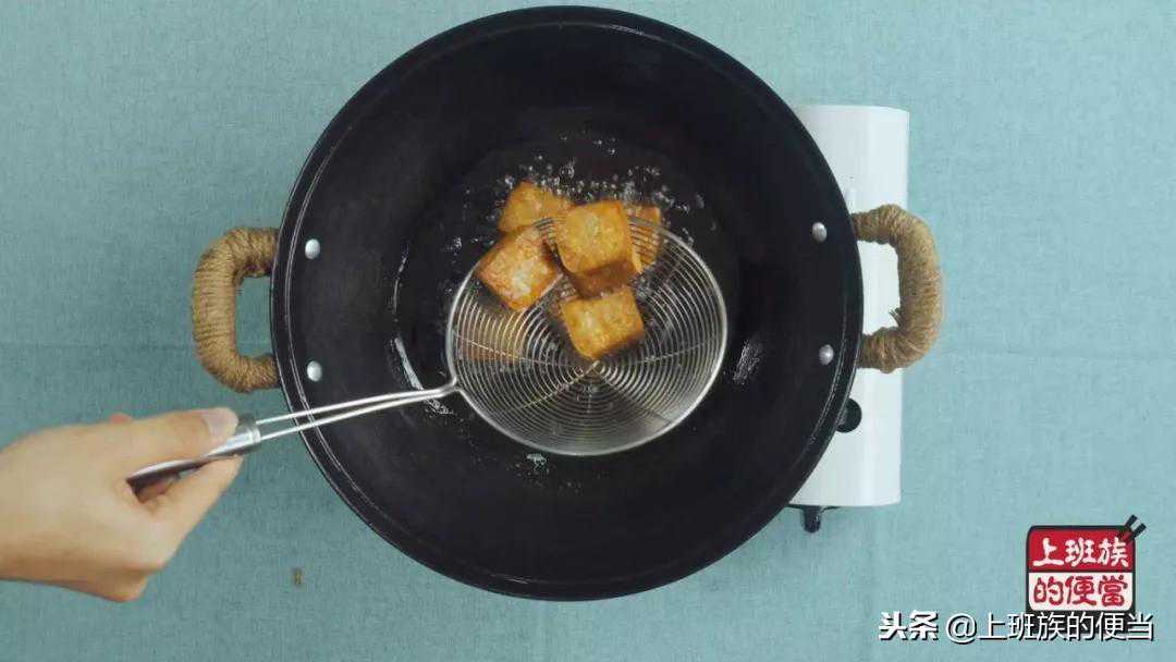 ▲把豆腐炸至金黄蓬松,滤油捞出备用;