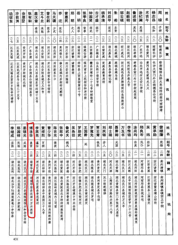 傅涤华,湖南华容人,黄埔军校第八期步步兵第二大队步兵第六队。1906年生,别号:象贤,籍贯:湖南华容,部别:黄埔军校第八期步步兵第二大队步兵第六队,其他方面没有记录,入校通信地址:湖南华容县注滋口万兴旅馆。