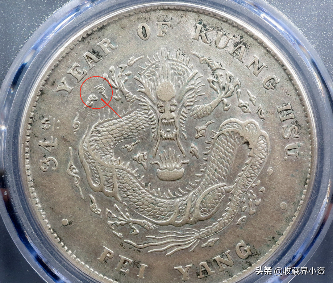 从这里开始算是版别的重要分界线,小字版的龙是沿用北洋29年的龙,大字版的龙可以说是全新开模的龙,大字版参考了北洋29年一样的①号内珠暗记,小字版则是具备①②③④号内珠暗记。大字版与小字版最简单的一眼法就是看龙头上的区别,大字版的龙头是圆鼓的,小字版的龙头是扁平的。大字版也有凹眼龙与实眼龙两大系列,先来讲