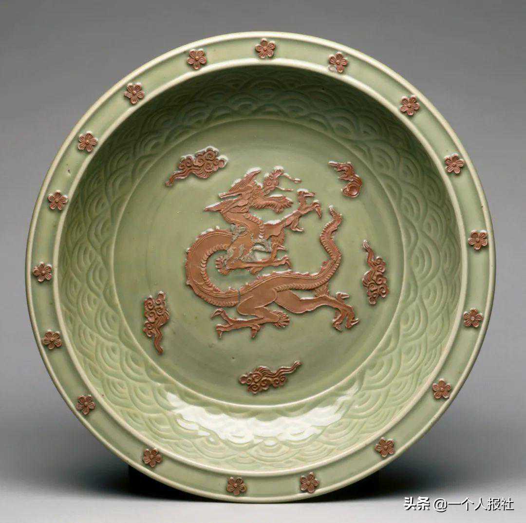 元龙泉窑青釉贴塑龙纹盘