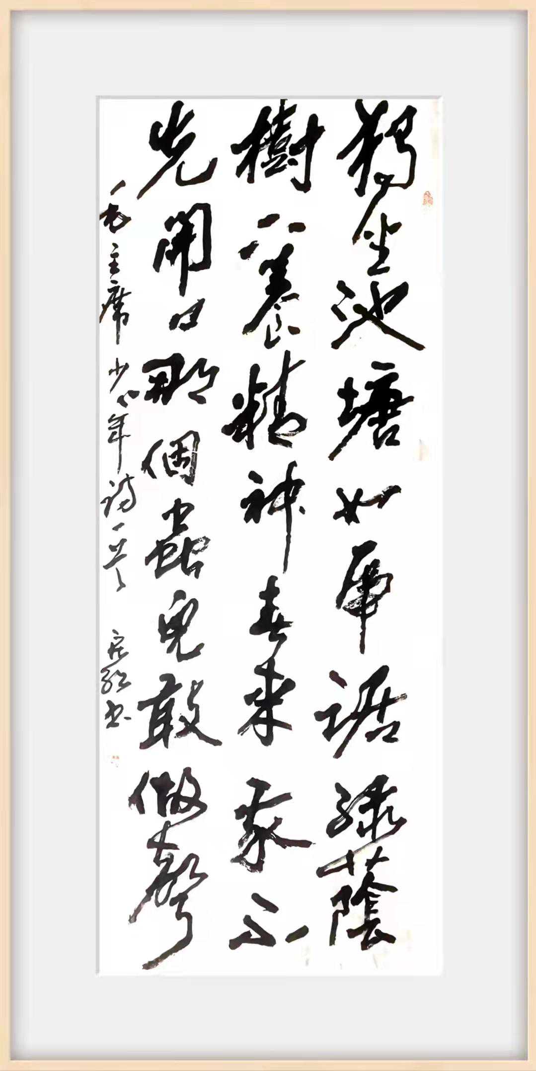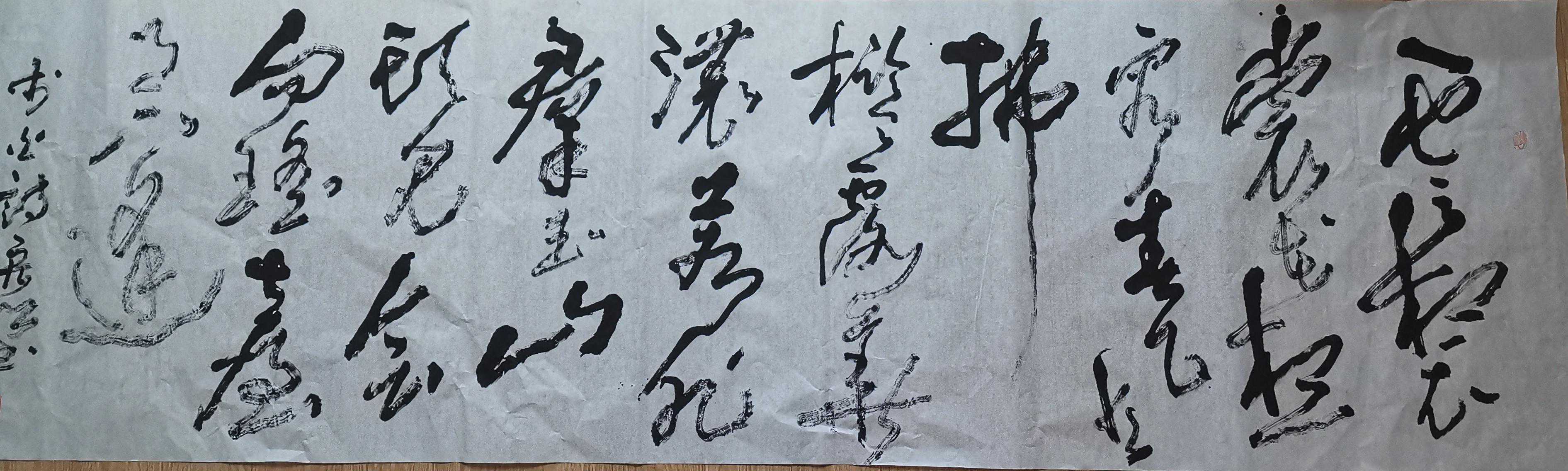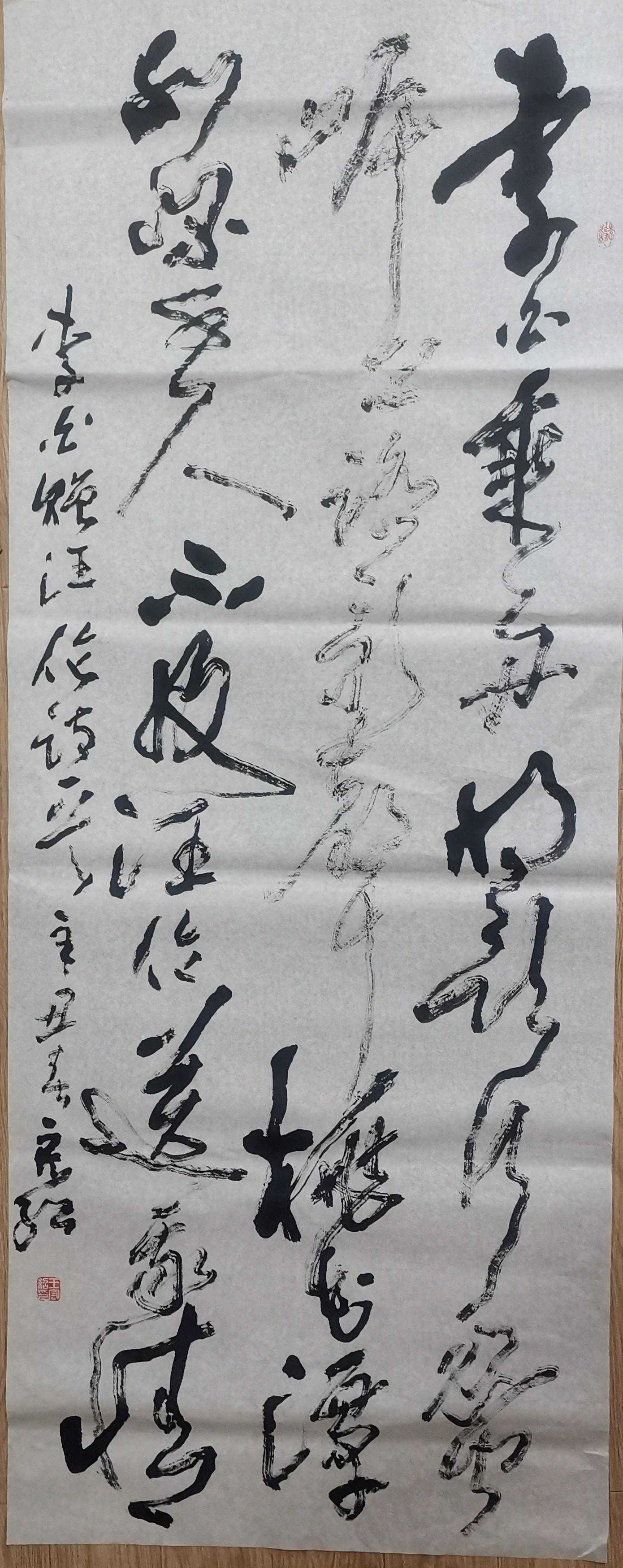 为了追求这种美,王宏绍气承先贤,搜掠出新,放手写心,我写我法,以线条为骨,以思想为魂,以墨色润身,以挥写发韵……逐渐将各种书体融为一体,注重章法形制变化,以抑扬顿挫的点线节奏,使抽象的书法形象展示出有如心灵运动的意趣。