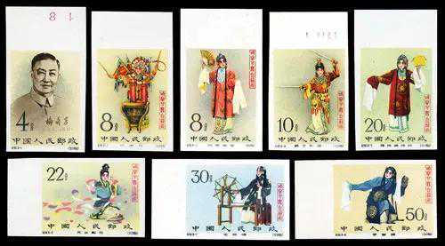 同时发行的还有一套同样内容但无齿的邮票,这也是中国第一次发行无齿孔邮票。当时,有齿的梅兰芳舞台艺术票发行了150万套,而无齿的发行量却很少,目前存世仅数千套,因此成为珍贵邮品之一。