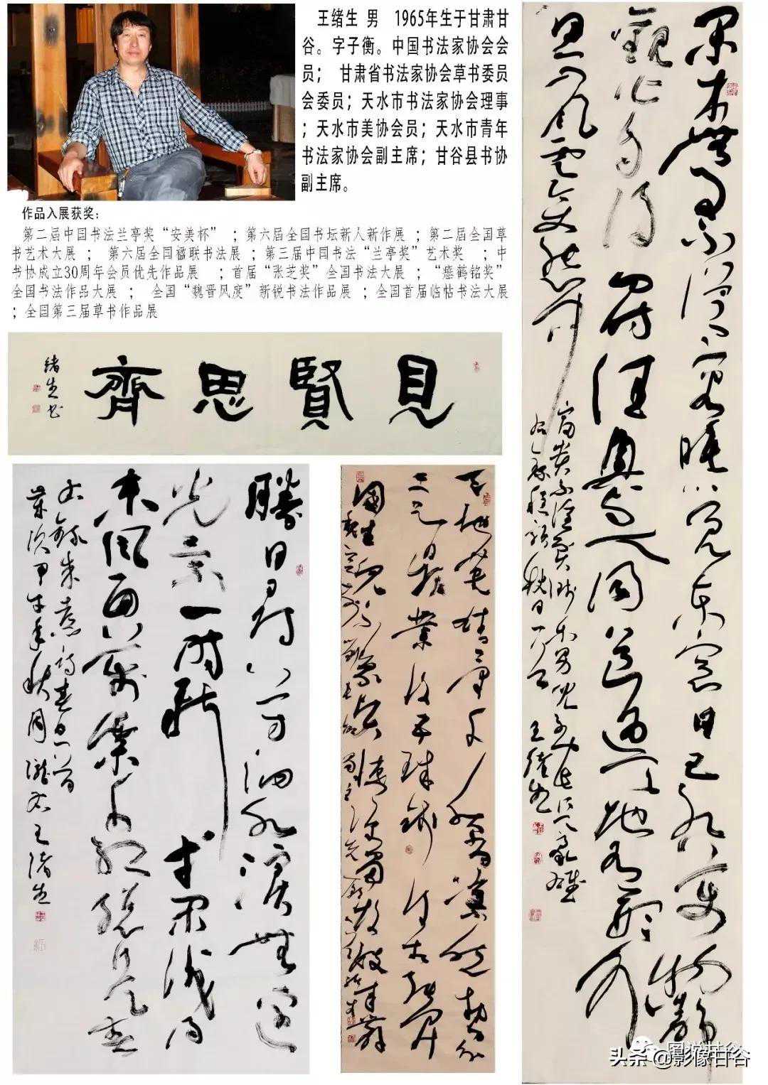 王绪生男1965年生于甘肃甘谷。字子衡。中国书法家协会会员;甘肃省书法家协会草书委员会委员;天水市书法家协会理事;天水市美协会员;天水市青年书法家协会副主席;甘谷县书协副主席;甘肃省摄影家协会会员;政协甘谷县第十二、十三、十四届委员。