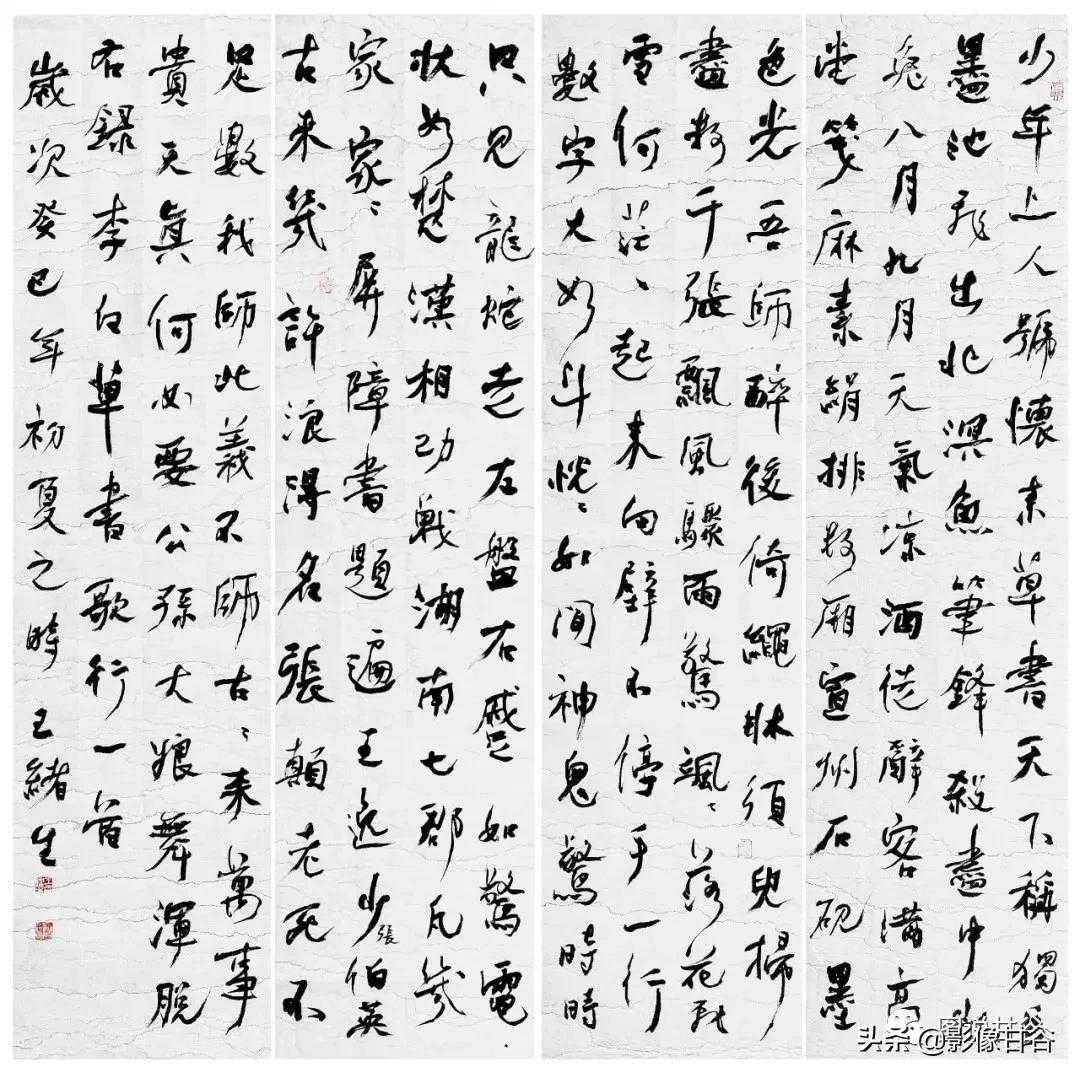 刘云鹏:王绪生的创作主要以行、草和楷、隶为主。其行、草书的点画在质感上向古人靠近,在形态上向今人借鉴,用笔出规入矩,顿挫圆转,挥洒自若;结体安排收放自如,顿宕纯和,扩张变形适度而精巧;章法构成疏密有致,大开大合,全篇一气呵成,神气自备;形成了一种洒脱俊逸的书风。隶书作品有《张迁碑》的骨架和笔意,并融入了当代的一些流行元素,显得古拙而又有新意。其楷书中我最喜欢他取法二爨的作品,用笔活泼轻松,结体奇异生动,很有情趣。