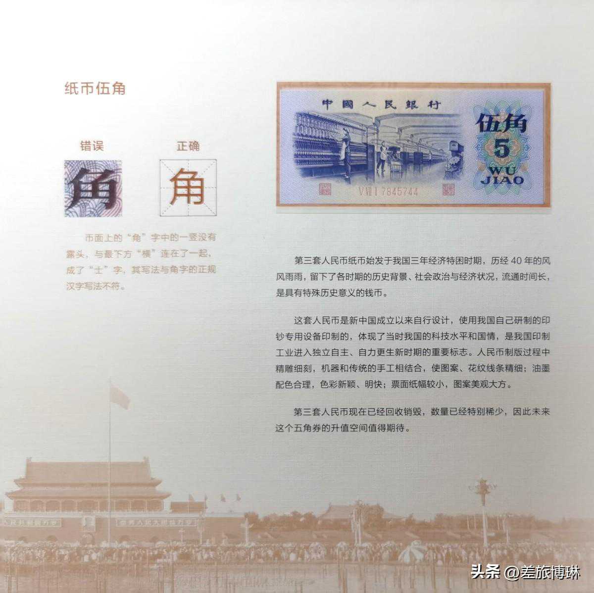 币面上的“角”字中的一竖没有露头,与最下方“横”连在了一起,成了“士”字,其写法与角字的正规汉字写法不符,同时,第三套人民币贰分纸币同样错误的把“贰”字两横印在了“弋”的左肩上。