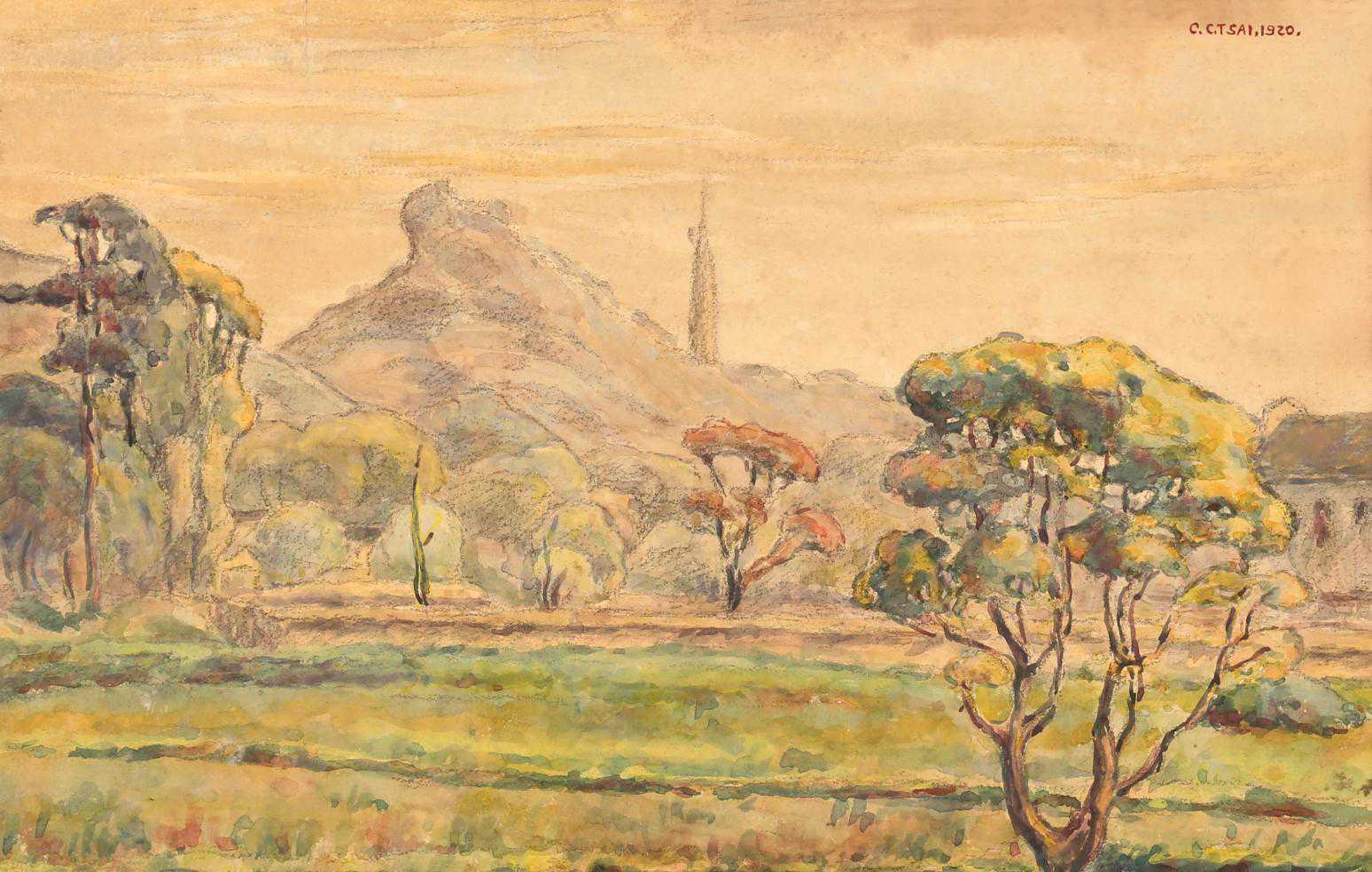 一个留法的、比较强调学院技法的、修养比较卓越的艺术家。他到了南方,加入到“客海上”的文脉记忆之中,会形成怎样的影响力呢?在上海美专短暂的任教时间中,他参与了西洋画科中的“野外写生”教学,当年主要的写生教学点在杭州西湖。从文献中,我们了解到他和刘海粟一起带学生去西湖写生,并发表作品《初秋》(预计1923年下半年完成,1924年春发表)。这幅画的原作已经失佚,画面后景的雷锋塔,不久后便倒掉了。
