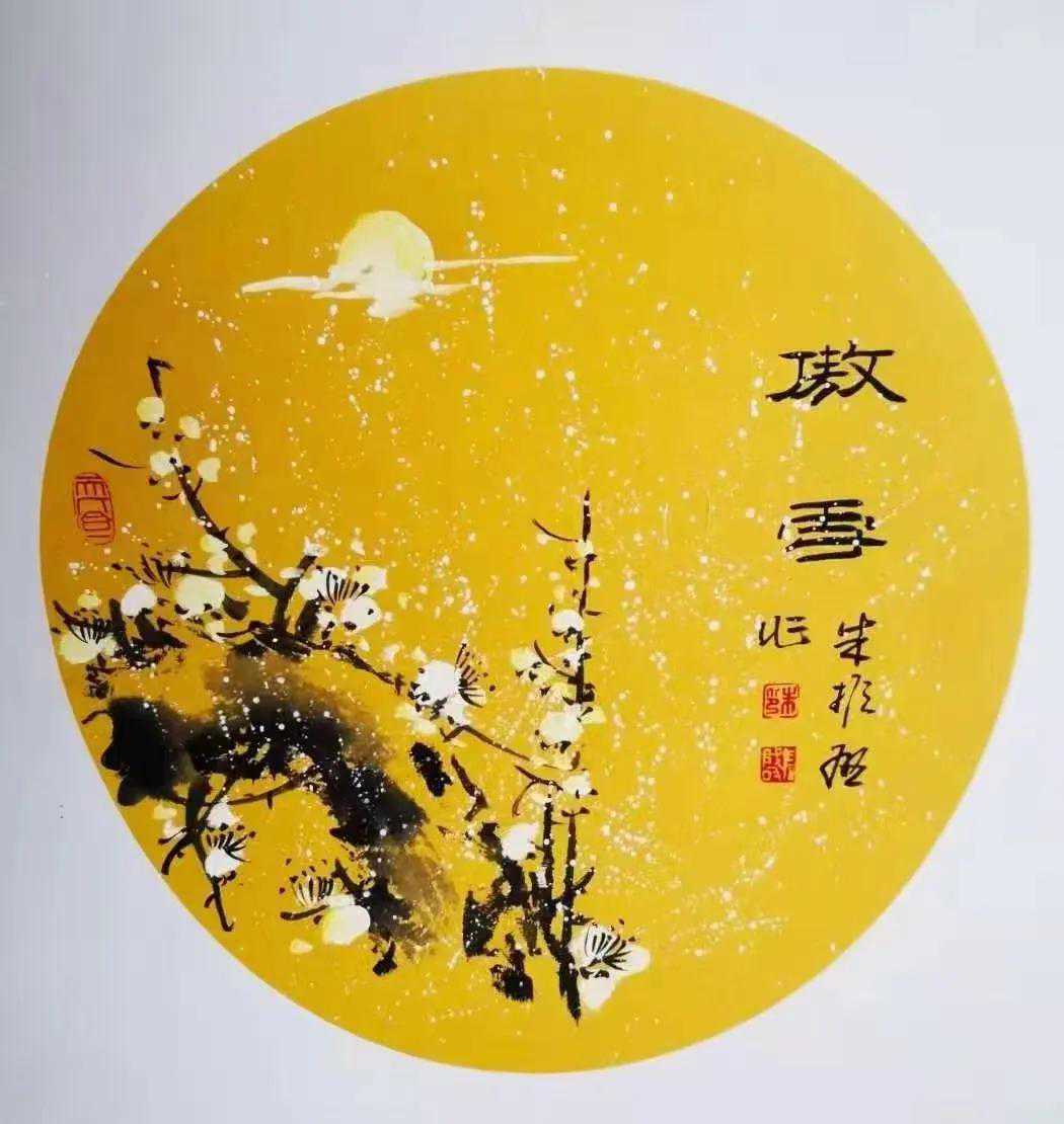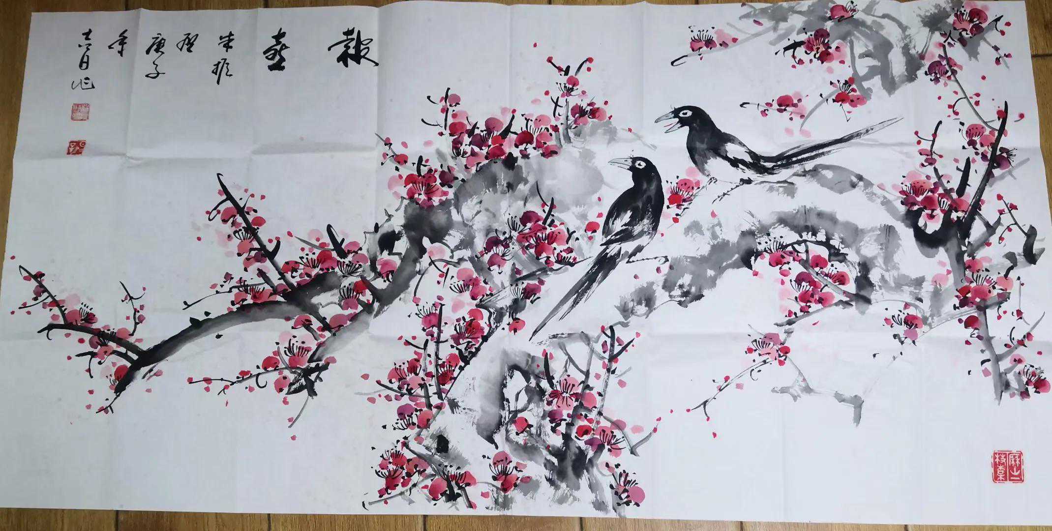 梅须逊雪三分白,雪却输梅一段香。在百花凋谢之时,唯有梅花生机勃勃。迎着漫天飞舞的雪花,傲然挺立在凛冽的寒风中。数九隆冬,地冻天寒,那傲雪而放的梅花,开得那么鲜丽,股股清香,沁人心脾,朱振启先生的写意花鸟画《报春》把梅花的傲骨和喜鹊压枝头的神韵描绘的囧囧传神。
