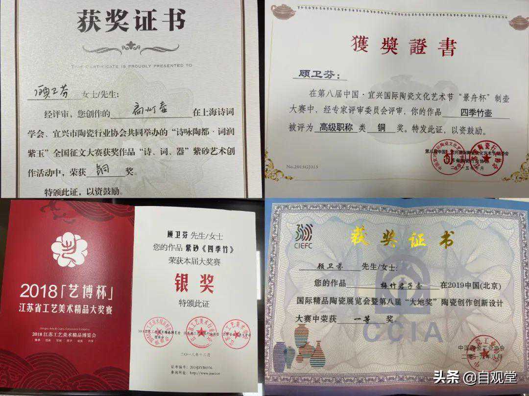 2015年,顾卫芬创作的《四季竹壶》在第八届中国·宜兴国际陶瓷文化节“景舟杯”制壶大赛中,被评为高级职称类铜奖;