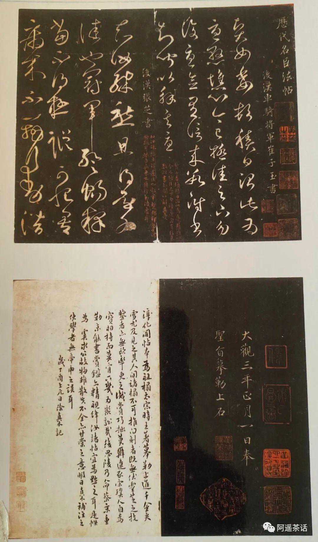 《大观帖》,北宋大观三年(1109年)一月徽宗诏刻,蔡京书签及卷首,立石于大清楼。此次鉴定仅见两卷,经折装。卷一,淡墨宋拓,收东汉章帝至唐代高宗等历代帝王草书和行书帖17种。卷二,浓墨元明拓,翻刻本,收东汉至晋五代各名臣张芝、钟繇、王象等草书、行书、小楷帖19种。草书旁边有清乾隆、嘉庆时人徐真木朱书注释。