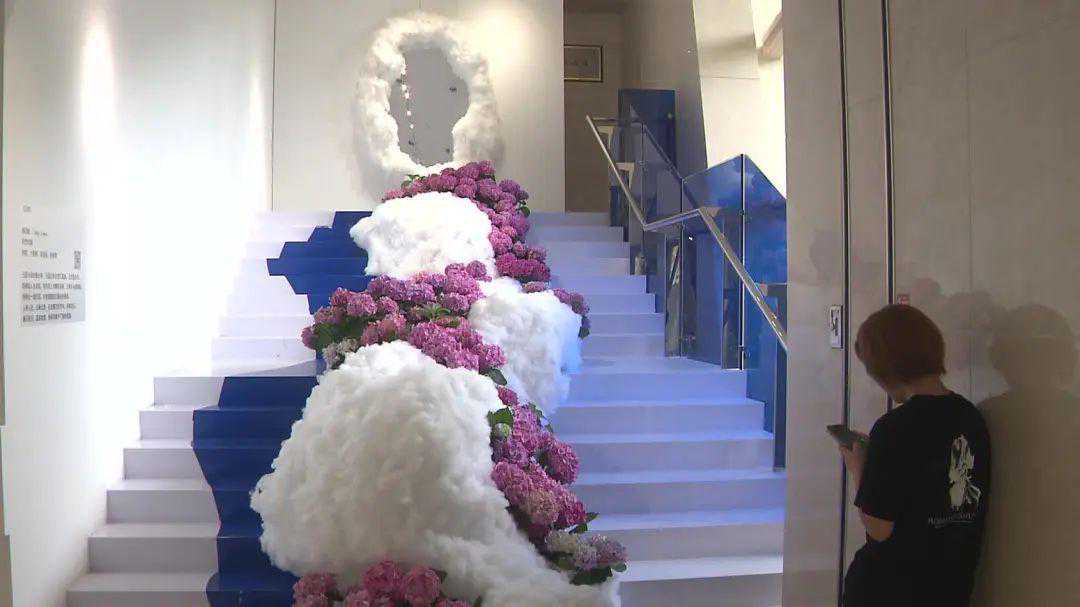 作品《云梯》是艺术家杨洁敏用棉絮、六角网、软面镜和绣球等创作出的作品。作品中阶梯如人生旅程,拾级而上攀到顶峰,尽头的镜面折射出一路的风景。