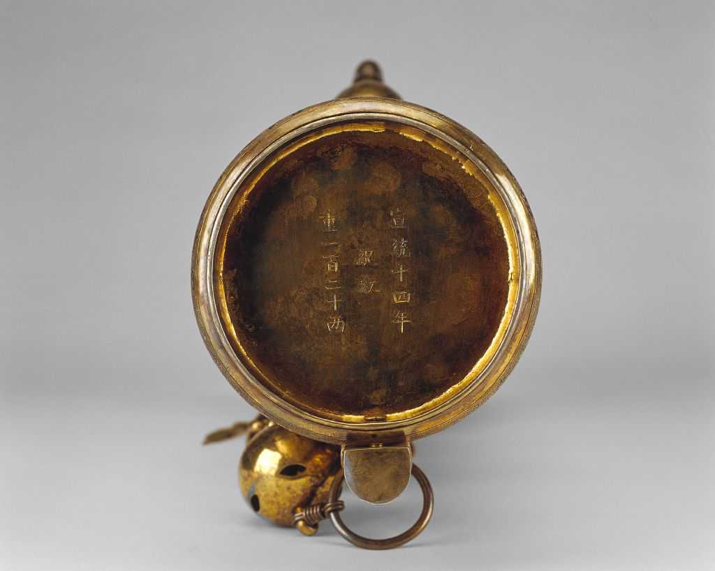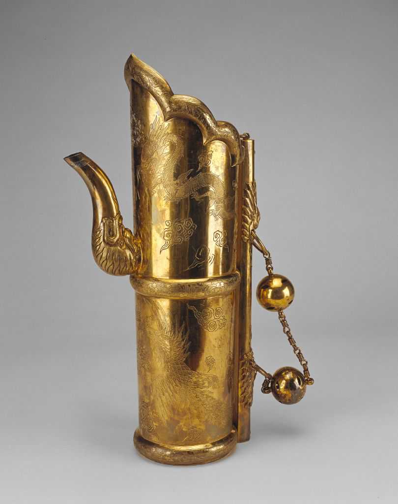 多穆壶是盛装酥油茶的器皿。尽管通体镀金,但由于金水较薄,器身多处的金色较为暗淡。原为帝后专享的龙凤纹臃肿、笨拙,雕工粗糙,从一个侧面反映了逊清皇室的衰败没落景象。