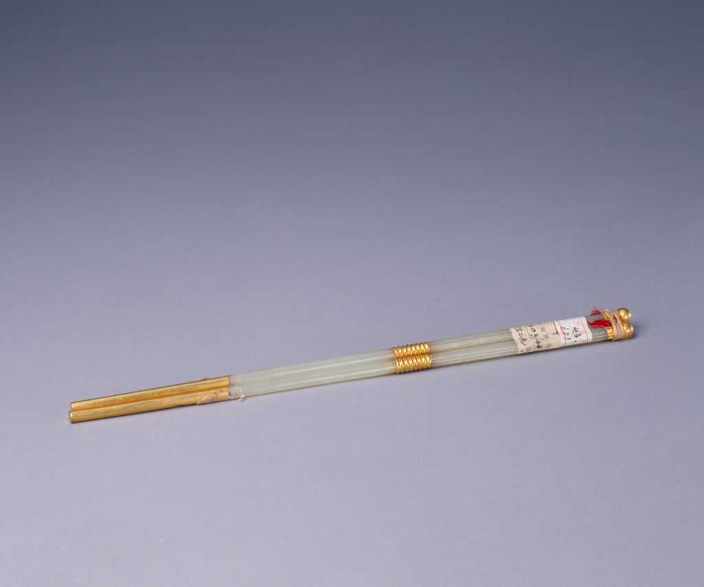 金嵌玉箸,清,通长28.9厘米。清代后妃用餐具。青白玉制成,筷子上部饰竖棱纹,顶端、中部和下部镶金三处。顶端为尖顶形,中部为凸环纹八道,下部光素。金为赤金,成色上佳。