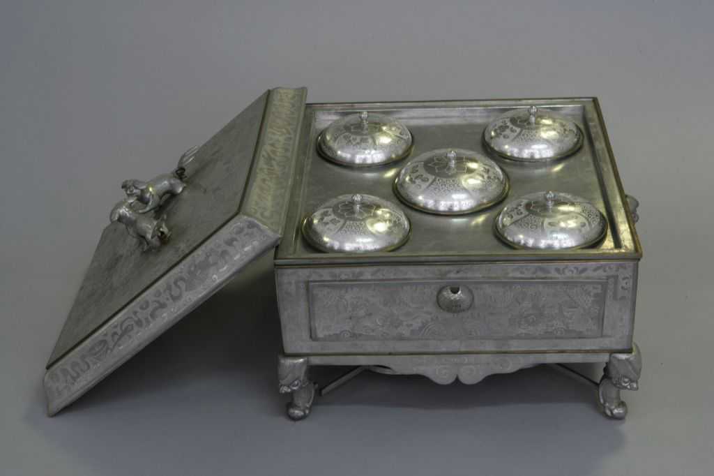 锡方形一品锅,清,高30厘米,口边长34厘米。这件锡制一品锅包括碗、碟、盖、座等共25件。锅的形状成正方形,内有5个锡碗,每个碗均配錾刻花卉图案的盖,碗下设有酒精碗。锅身设有4个插孔,并配有4个支架,将支架插入孔中即可以承接雕刻花卉的小盘。锅身周边刻有各种花卉图案;底部有4个象鼻形锅架支腿,支撑锅的整体;锅盖上有塑造的狮子为纽,形象生动。整体构造巧妙,造型美观大方,制作工艺精良,是宫藏锡器制品中不可多得的文物珍品。