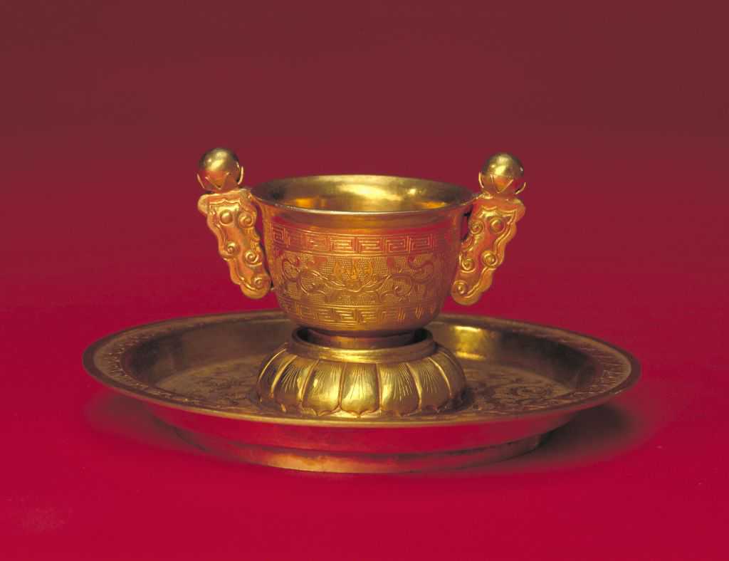 金、玉的使用历来是地位和财富的象征。在中国历史上,美玉的使用较黄金要早许多,两者在很长一段时间内并行发展。明代服饰、器用上开始流行金、玉并用。皇家用具,极尽奢华之能事,金、玉不仅用于服饰或陈设,也用于饮食器具,展示了金玉满堂的富贵荣华。清代帝王大婚或是太后、皇帝万寿庆典,通常专门制作成套精美的服装、饰品、器用,并分别装饰标志性的“喜”、“囍”或“寿”字。此器錾有“囍”,是清代皇帝与皇后的婚庆用品。