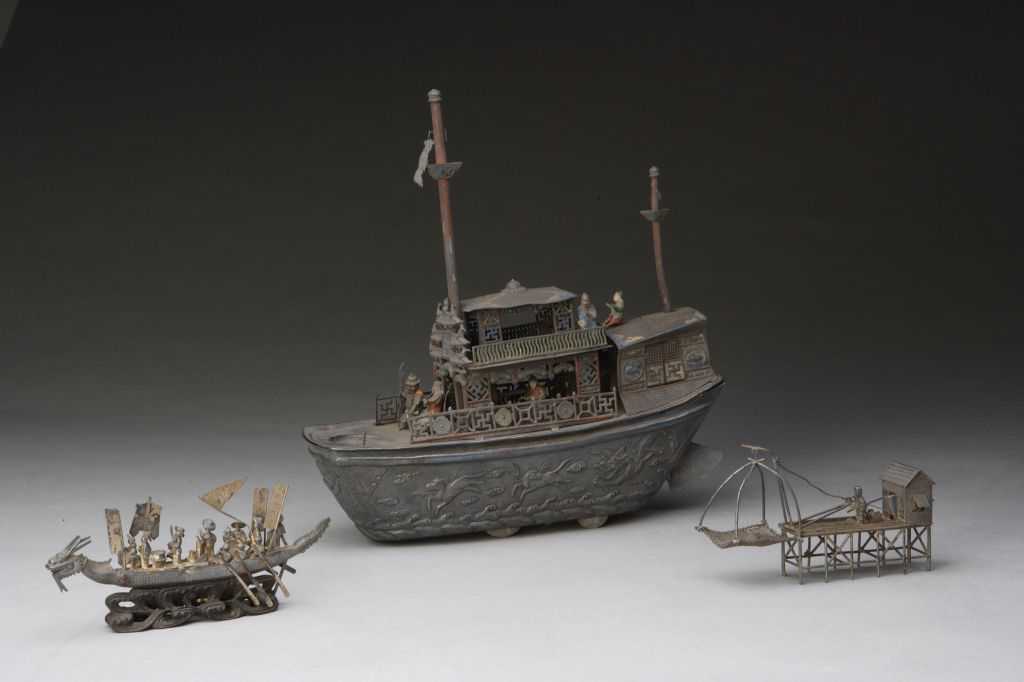 中间的小银船为中国传统式样,船体上还有麒麟、卷云等纹饰,船上阁楼有中式菱格窗,船底有轱辘,船尾可上弦,这很可能是一件能放在地上跑的玩具旱船。