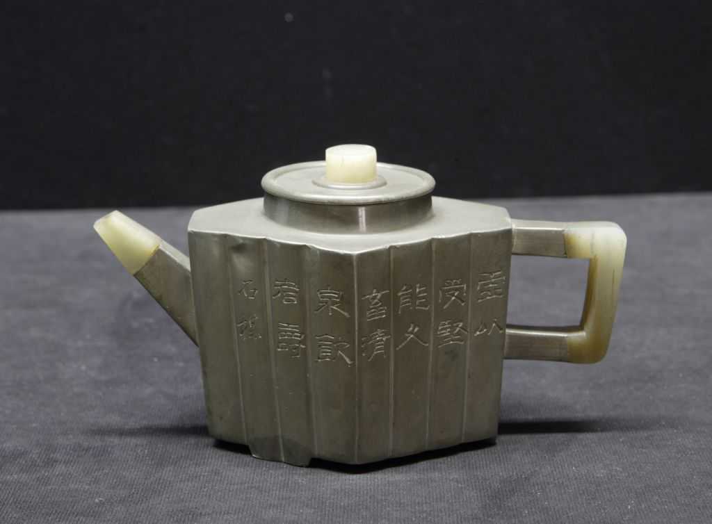 壶身为菱形立柱体,四立面呈瓜棱形,盖钮、流嘴、壶柄配接白玉。壶外壁阴刻隶书“壶以受坚,能久畜清泉,饮者寿。石楳。”
