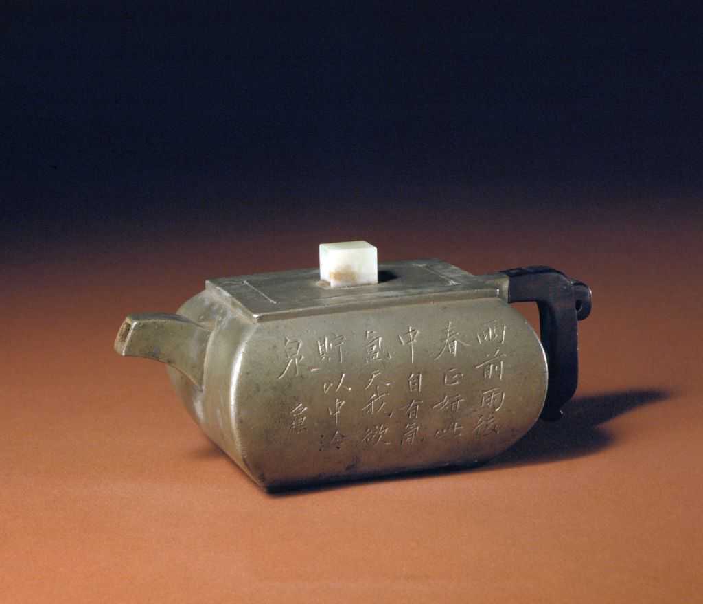 壶方体,敛口,鼓腹,平底,三角形足,长方形盖,玉顶,木柄。腹壁一面刻梅花图,旁书“暗香浮动。朱坚写。”相对的另一面刻“雨前雨后春已妍,此中自有氤氲天,我欲贮以中泠泉。石楳。”木柄嵌银丝,篆书“石楳制”。壶内底刻篆书“永宝”二字。