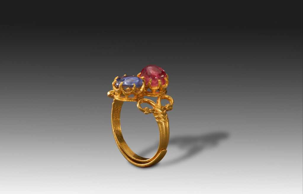 【金嵌红蓝宝石戒指】金嵌红蓝宝石戒指,清,通长2.3,径1.8厘米。
