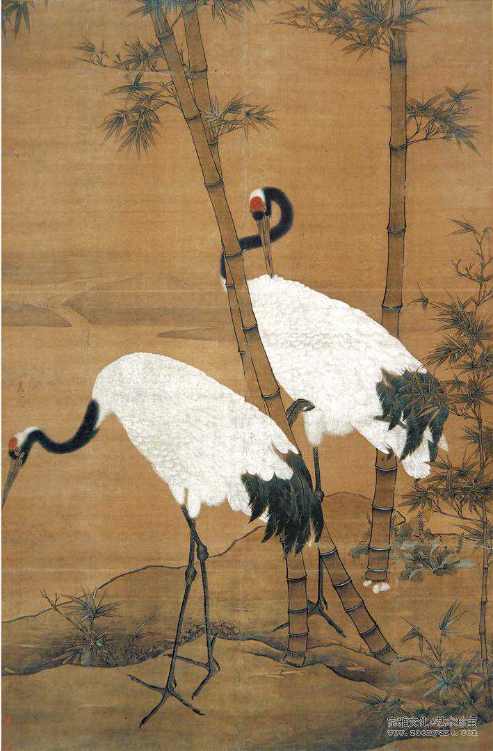 《竹鹤图》是一幅吉祥瑞寿题材的画作。仙鹤喻示着长寿,是一种吉祥之物,且其形体优美、步履翩跹,能给人一种优雅的感觉,所以经常被画家表现。《竹鹤图》描绘的是两只仙鹤在竹林间自由自在生活的情景。画面中,溪水坡岸上有两只白鹤,一只低首下喙觅食,另一只转项回首梳理白羽,展现出一副悠然自得的样子;三枝修竹十分挺拔,旁边的一丛小竹又丰富了画面。